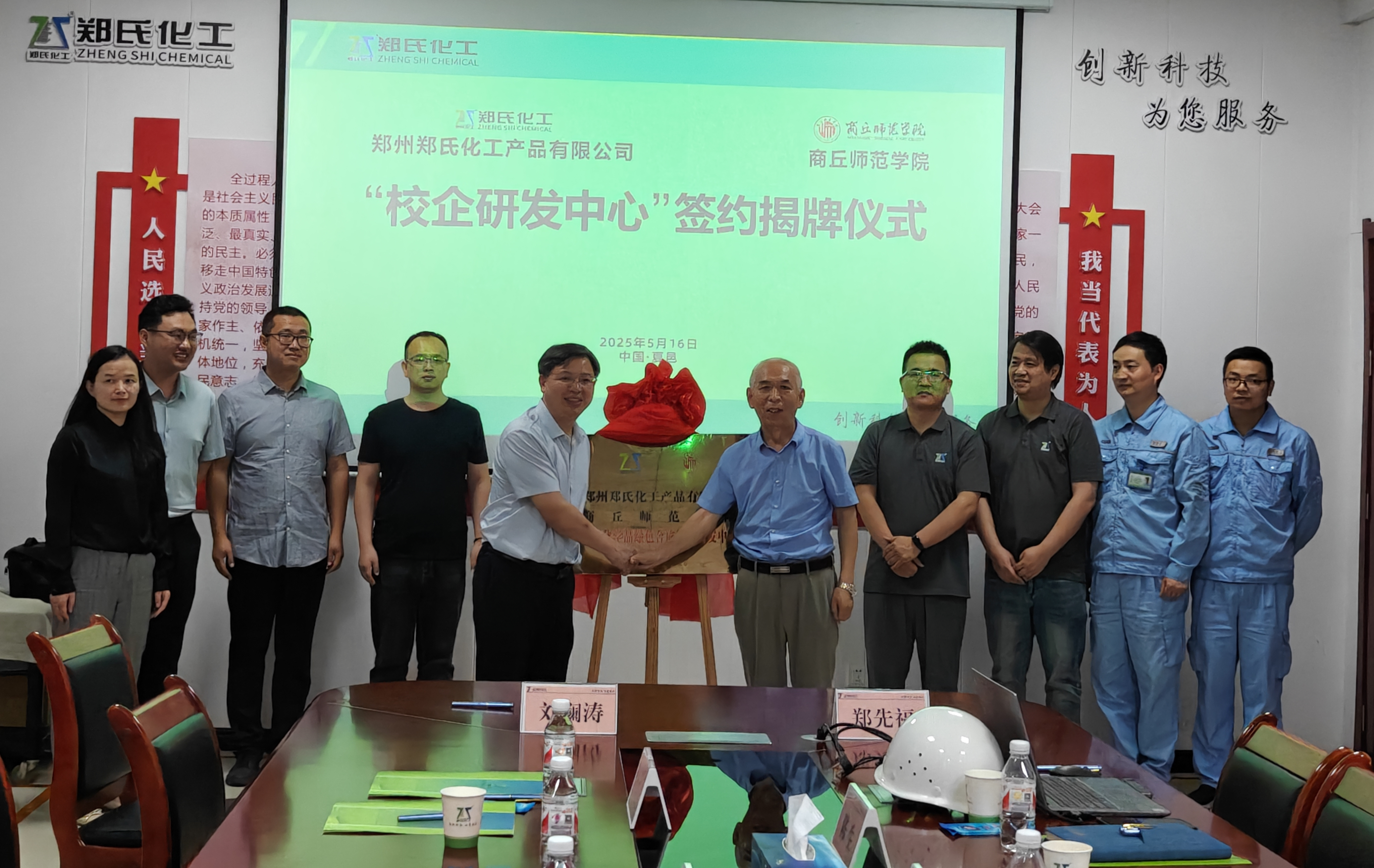 签约仪式上,刘澜涛和郑先福签订了校企共建研发中心合作协议,刘澜涛和郑先福共同为“农用化学品绿色合成校企研发中心”揭牌。
