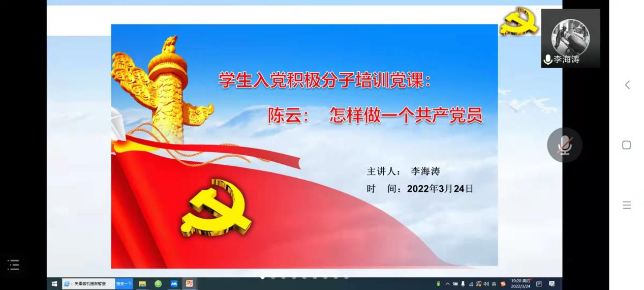 为帮助入党积极分子明确入党目的,端正入党动机,3月24日,金年会jinnianhuicom利用腾讯会议举行以“陈云:怎样做一个共产党员”为主题的入党积极分子党课培训,由院党委书记李海涛主讲,全体入党积极分子参加。