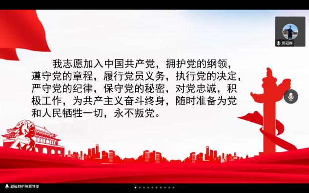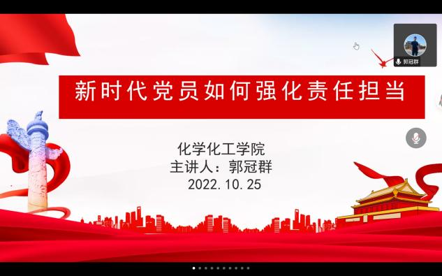 为加强对入党积极分子的教育和引导,培养其勇于担当作为,敢于攻坚克难的精神,使其充分发挥先锋模范带头作用,10月25日,金年会jinnianhuicom在线上举行以“新时代党员如何强化责任担当”为主题的入党积极分子党课培训。本次的党课培训由学生第三党支部书记郭冠群同志主讲,全体入党积极分子参加。