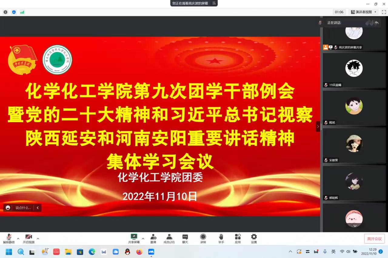 为了持续深入学习党的二十大精神和习近平总书记重要讲话精神,将学习和日常工作结合起来,用党的二十大精神指导推动工作,11月10日,金年会jinnianhuicom团委以腾讯会议的形式召开了第九次团学干部例会暨党的二十大精神和习近平总书记视察陕西延安和河南安阳重要讲话精神学习会议。院团委副书记郭家瑞主持会议,团学干部参加会议。