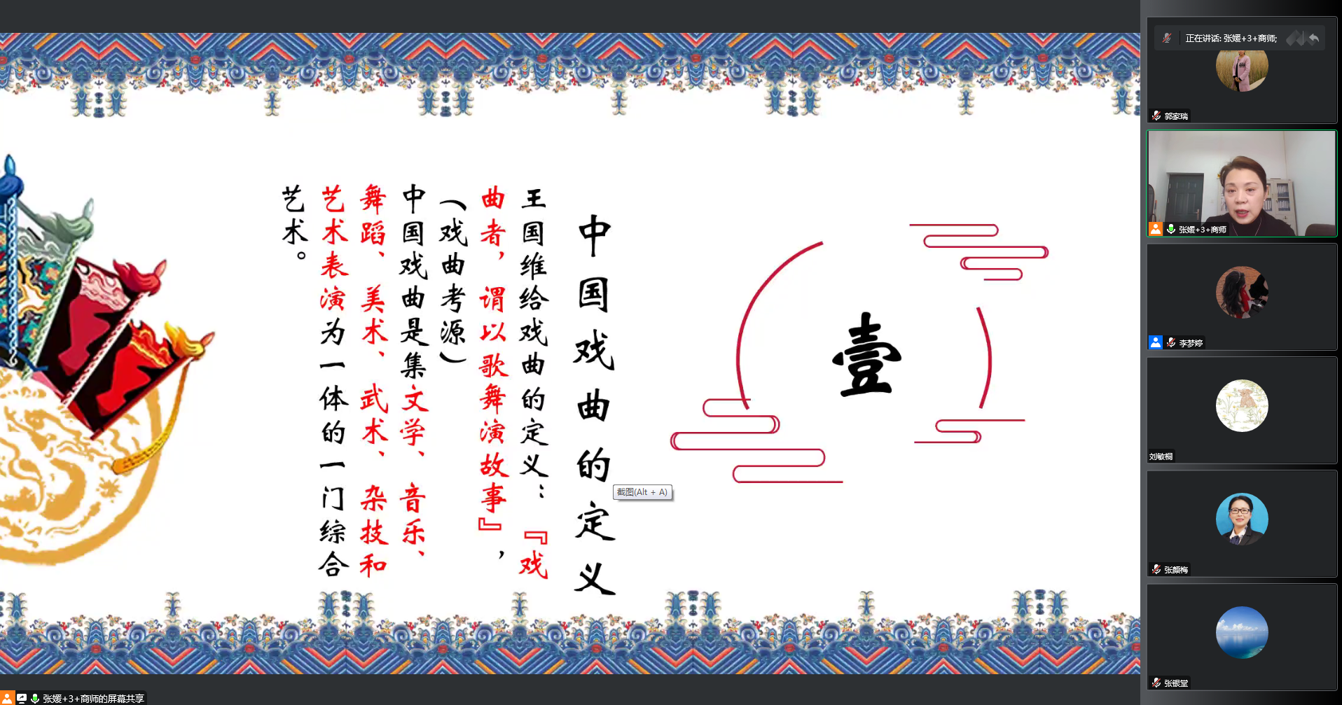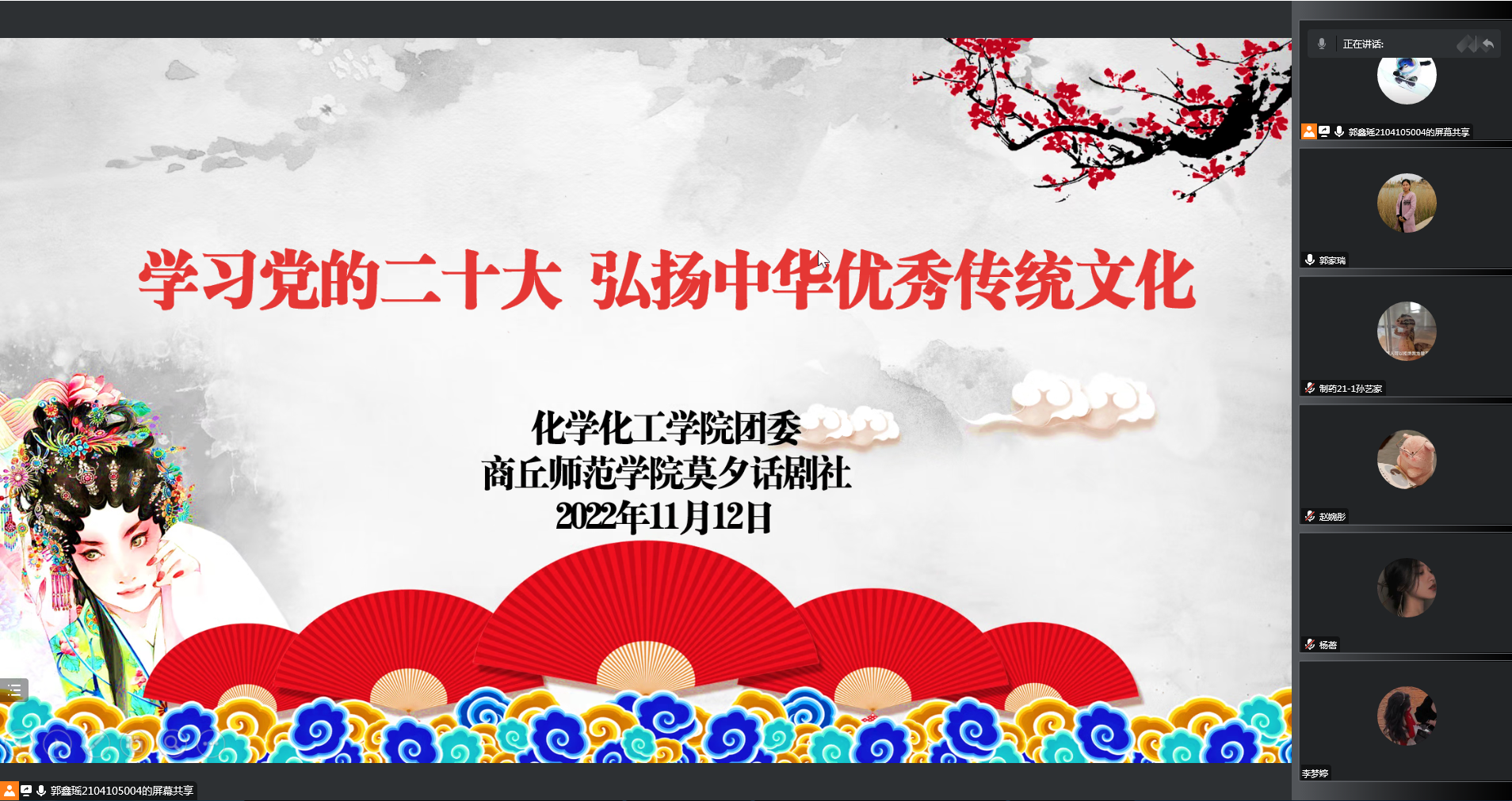 为了深入学习党的二十大精神,更好地弘扬中华优秀传统文化,争做奋进新青年,11月12日,金年会jinnianhuicom团委和金年会jinnianhuicom莫夕话剧社在线共同开展了“学习党的二十大,弘扬中华优秀传统文化”主题讲座,邀请音乐学院院长张媛做了“品鉴戏曲之美,传承民族文化”主题讲座。金年会jinnianhuicom院长张银堂、院党委副书记张颜梅出席活动。全校200余人参加活动。