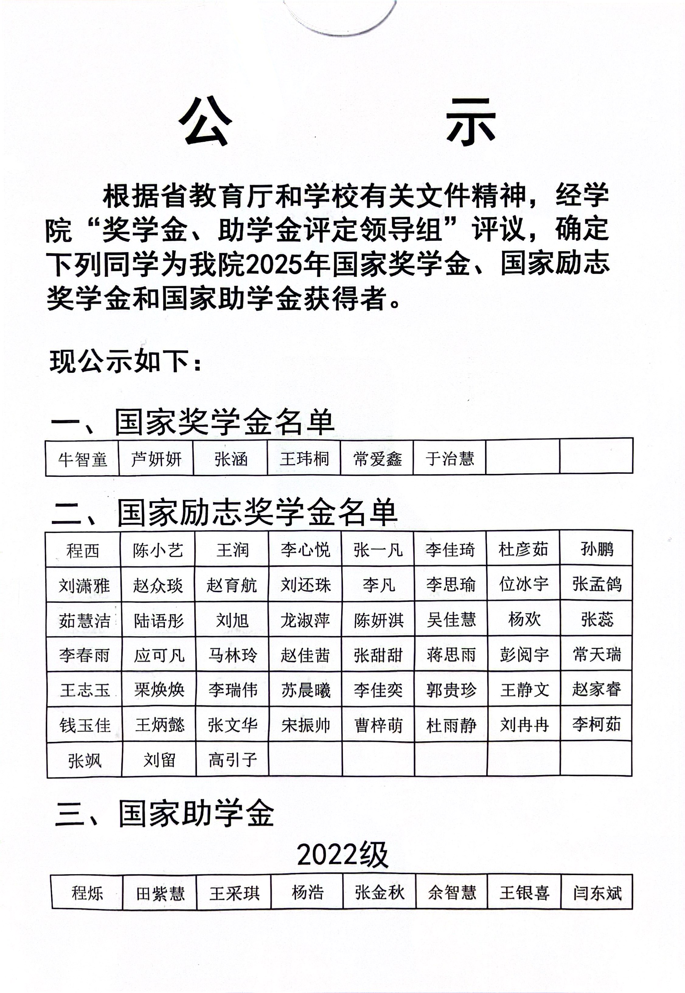 金年会jinnianhuicom2025年国家奖学金、国家励志奖学金和国家助学金公示名单