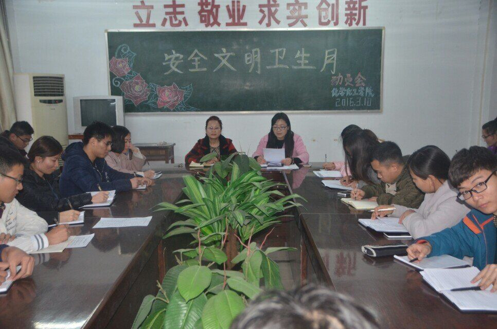 首先,由李龙梅老师宣读2016年“安全文明卫生月”活动实施方案。重点强调了本次的活动的具体内容:深入开展文明主题教育活动,全面开展安全教育主题活动,深入开展“第二届宿舍文化节”的评选活动,开展校园文化建设主题教育活动以及开展“三爱三节”主题教育活动。随后,刘瑛院长针对活动实施方案做了工作部署和具体要求,她希望学生干部在学习和生活上起模范带头作用,积极带动身边的同学,希望同学们都能够积极参与到学风建设中来,为营造良好的学习和生活环境而共同努力。