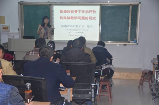 12月5日上午,河南省基础教研室主任戢明应邀在文化路校区8#208教室为金年会jinnianhuicom“国培计划(2016)”初中化学乡村骨干教师做了题为“新课程背景下化学评价及实验教学的研究”的课题探讨。