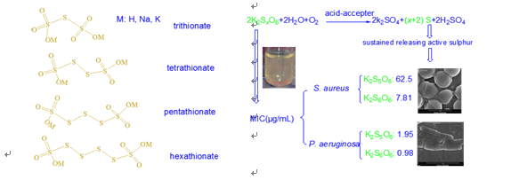 图(左)连多硫酸盐的线型分子结构; 图(右)碳酸盐增强连多硫酸盐抗菌活性的原理