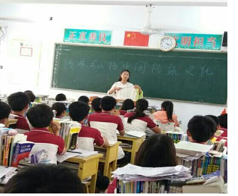 团队一行七人在高一(1)教室举办了以汉服体验和汉服配饰欣赏的艺术体验活动。学生热情很高,老师也被吸引,在教室里团队志愿者向同学们介绍汉服,了解她的特色和非凡的美丽。
