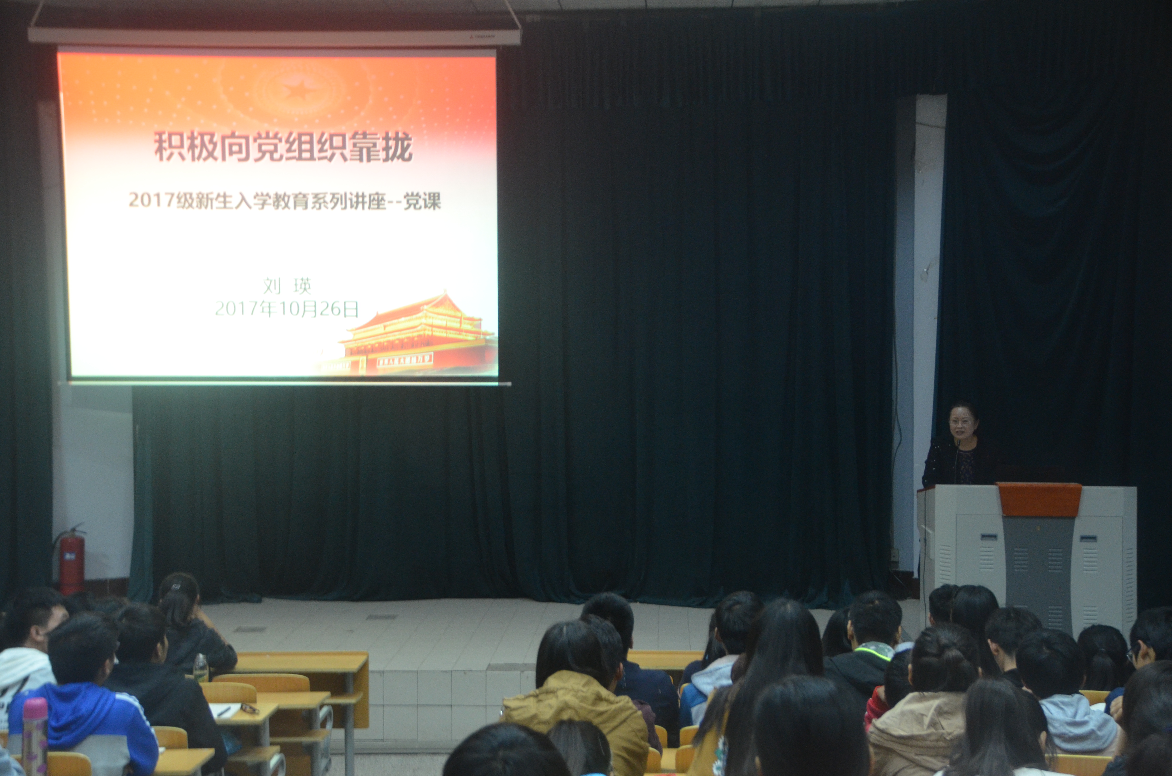 刘书记以“积极向党组织靠拢”为题,为2017级新生入学教育系列讲座进行了开讲。讲座伊始,刘书记先从革命先烈和优秀共产党员的先进事迹讲起,带领同学们回顾了中国共产党96年的奋斗历程,使同学们充分认识到没有共产党就没有新中国,没有共产党的领导就没有现代中国的一切,中国共产党是值得当代青年追随的一个政党。同时使同学们进一步明白了大学生为啥要入党。接下来她详细介绍了入党申请书、思想汇报、个人自传的书写要求。最后,刘书记向全体新同学发出了积极加入党组织的号召,希望同学们能够深入学习党的基础知识,科学文化知识,积极向党组织靠拢,争取早日加入中国共产党,为中华民族伟大复兴贡献自己的一份力量。