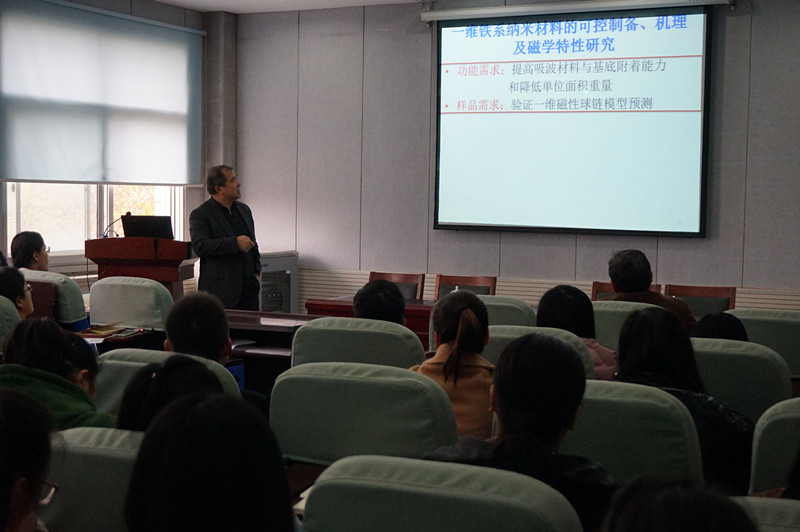 在学术报告中,郭林教授首先介绍了铁系纳米材料的可控制备、机理及磁学特性研究。郭教授课题组合成了一系列表面粗糙度、长度、粗细可控的Fe、Co、Ni纳米链,作为吸波材料,可增强与飞行器表面附着力,并减轻了单位表面积的重量。通过一系列一维纳米材料的研究,郭教授课题组首次验证了Neel-Brown公式并对其进行了修正,取得了理论性的突破。接下来,郭教授又从微、纳有序结构的设计与组装方面给大家介绍了一系列研究成果。通过成果展示,郭教授教导学生在开展科研实验之前要学会利用热力学、动力学理论对纳米材料的调控、组装并预测功能。做到先用理论指导实验,再用实验验证理论。郭教授的学术报告深入浅出,讲解诙谐幽默,不时引发大家的笑声和热烈的掌声。报告会不仅给大家学术上的启迪又让大家感受到做科研的乐趣。