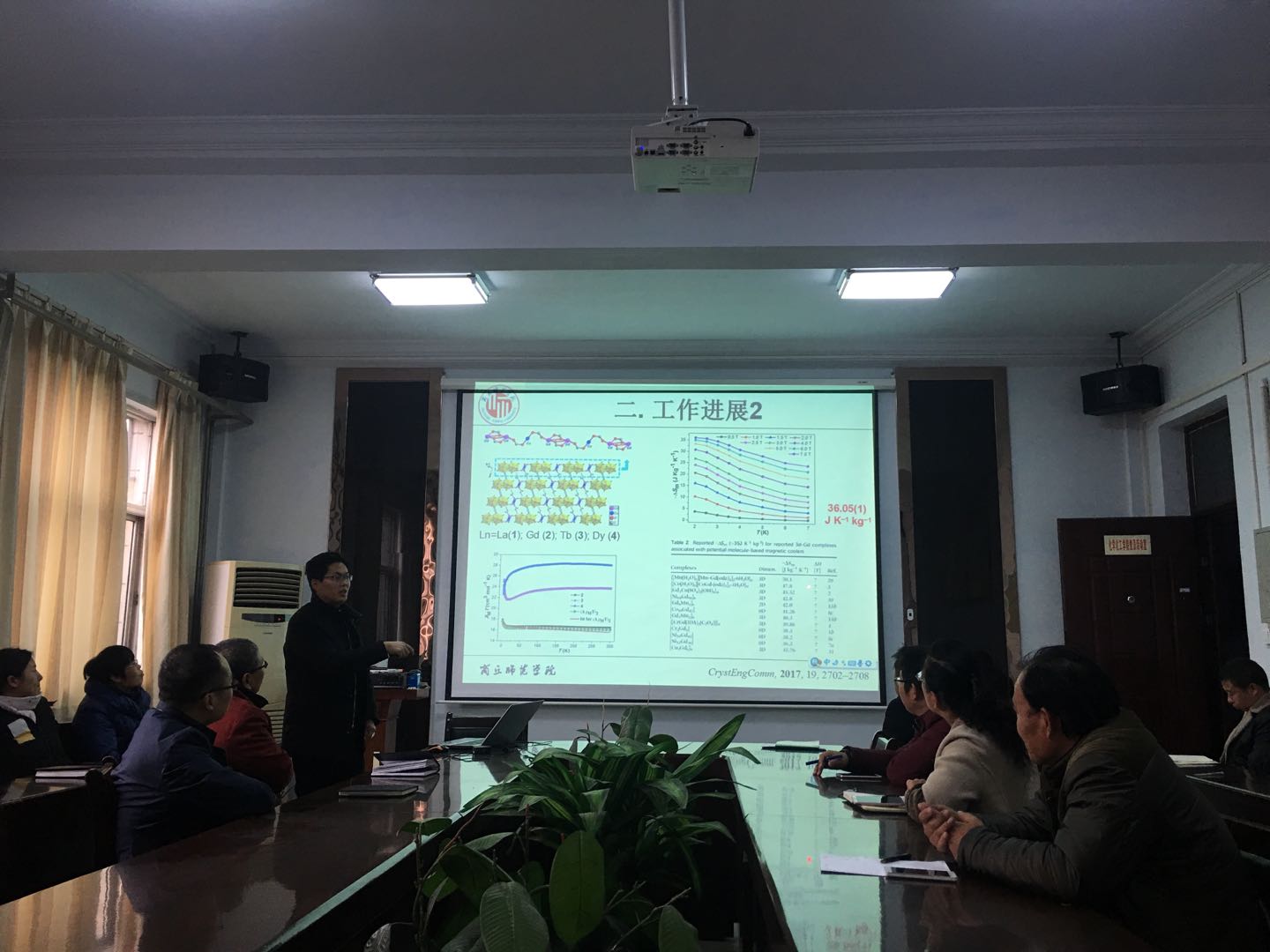 2017年12月29日下午,金年会教师李忠义博士在文化路校区7号楼院会议室做了题为《晶态金属有机功能配合物的磁光性能研究》的学术报告会。金年会jinnianhuicom全体院领导及教师参加了报告会,报告会由韩忠民书记主持。