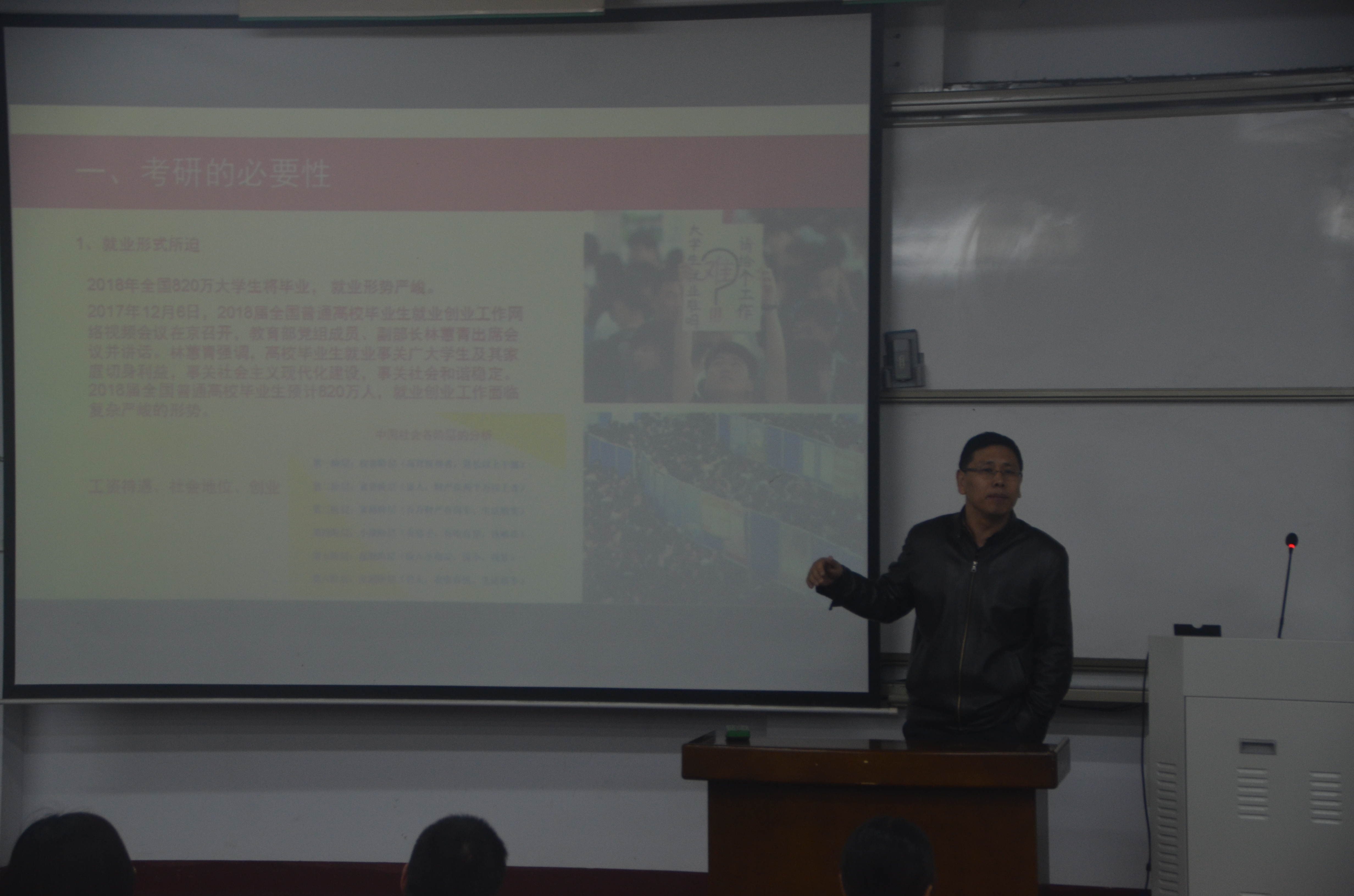 大会开始,由副院长孟团结从考研的重要性、考研政策等几个方面为同学们进行讲解,他希望同学充分认识到考研的重要性,尽快确定报考的学校和专业并做好英语、政治、数学、专业课的复习准备。副院长巧妙的结合寓言故事为同学们分析利害,告诫同学们要有准备吃苦的决心、克服困难的信心、抵制各种诱惑及耐得住寂寞的恒心,调动了同学们的积极性,现场气氛十分活跃。随后,于丽敏老师和郝远强老师也就考研的重要性为同学们进行分析,希望同学们能够积极考研,为自己的将来做规划。最后,院长瞿鹏告诫同学们要好好把握考研的机会,积极备考。此外还对学生提出的问题结合亲身经历进行详细解答,同时对有困惑的同学进行思想引导,对他们在学习和处事上提出了希望与要求,现场气氛达到高潮。