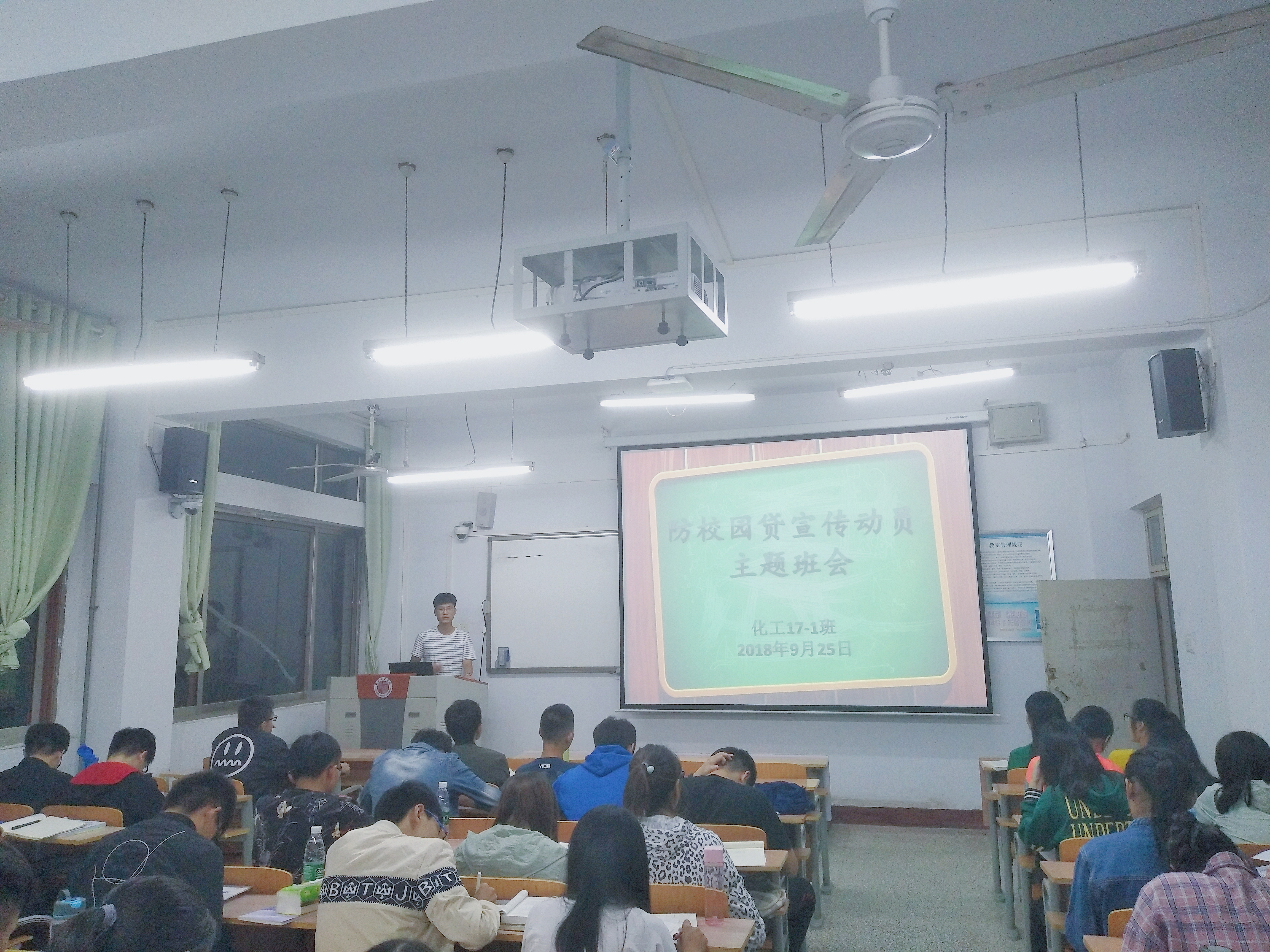 9月25日晚,金年会jinnianhuicom化工17-1班及新能源17-1班于文化路校区1#412开展防校园贷宣传动员主题班会。班会由化工17-1班班长李远洋主持。