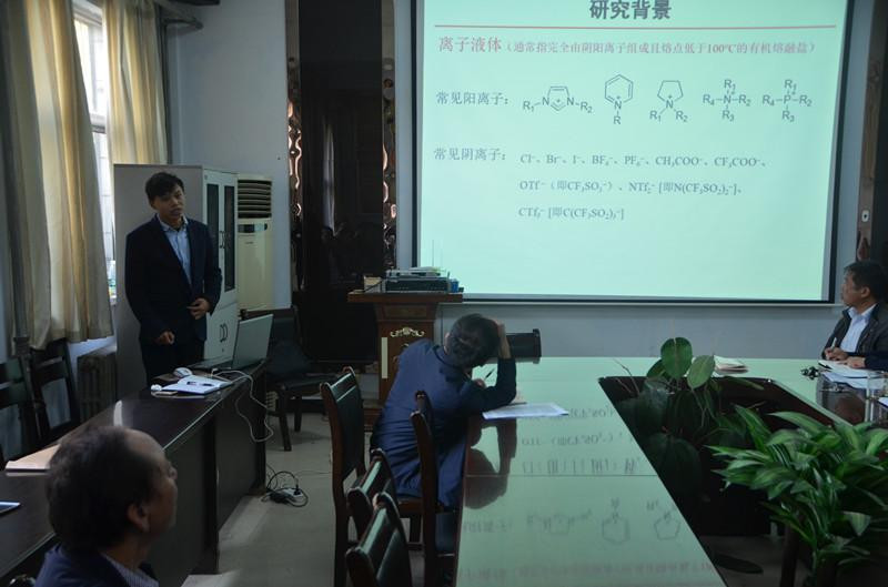 张永亚博士向大家汇报了攻读博士学位期间在聚离子液体的合成与应用领域所做的工作。首先介绍了聚离子液体的独特的溶胀性能以及溶胀度大小与结构的构效关系;然后利用聚离子液体的溶胀性提高多相催化剂的催化活性,达到类均相的催化效果并有效降低反应能耗;利用可溶胀聚离子液体三维网络结构的超亲水性和疏油性,制备出可以高效分离油水混合物的功能膜材料。相关研究成果发表在ACS Macro Lett.,Green Chem.等国际期刊上。报告最后,各位老师就聚离子液体的催化性能以及催化反应选择等方面与张永亚博士进行了深入的交流。