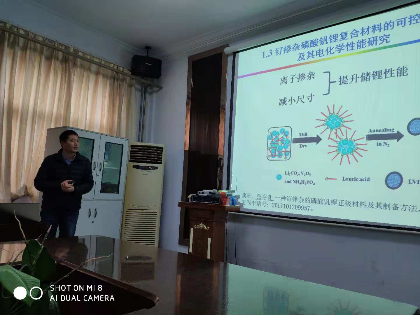 张存良博士向大家汇报了攻读博士学位期间在锂离子电池电极材料领域所做的工作。首先介绍了氮掺杂的碳材料(碳包覆层、石墨烯)包覆改性磷酸钒锂电极材料的方法和氮掺杂对电极材料结构及电化学性能的影响机制;提出将体相离子掺杂与电极材料纳米化相结合制备磷酸钒锂纳米复合材料的方法;讲解了高温液相制备磷酸钒锂纳米晶的方法,阐述了制备机理、材料结构与电化学性能之间的作用机制;然后,汇报了近期将要开展的研究计划。相关研究成果发表在Journal of Solid State Electrochemistry,RSC Advances等国际期刊上。报告最后,各位老师就锂/钠离子电池电极材料的制备及应用等方面与张存良博士进行了深入的交流。