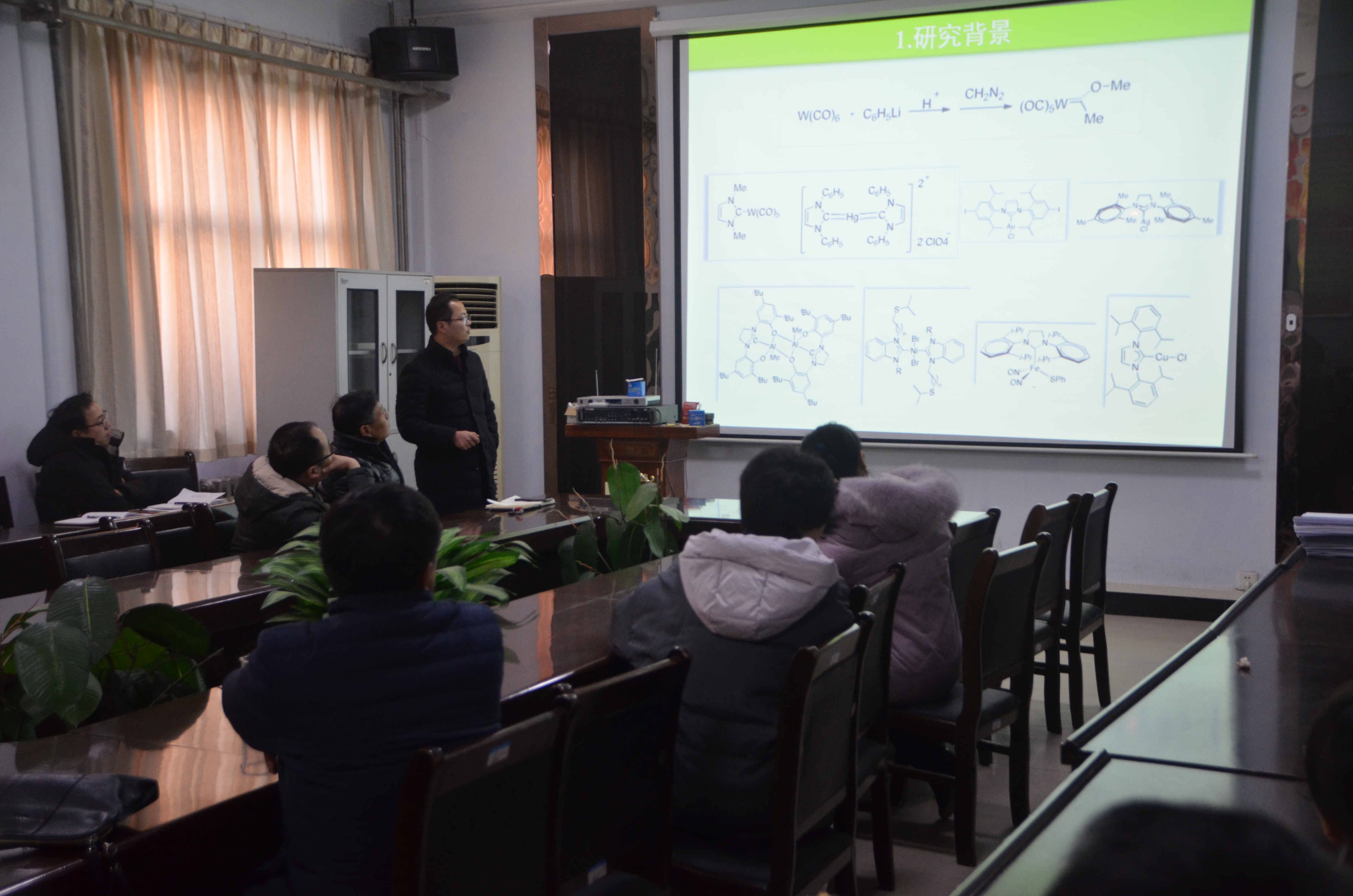2018年12月28日下午,金年会jinnianhuicom教师王涛博士和蒲三旭博士在文化路校区7号楼院会议室分别做了题为《新型氮杂环卡宾钯化合物的设计合成及其在偶联反应中的应用研究》和《纳米粉体合成制备的相关研究》的学术报告会。报告会由周艳丽副院长主持,金年会jinnianhuicom全体老师参加了报告会。