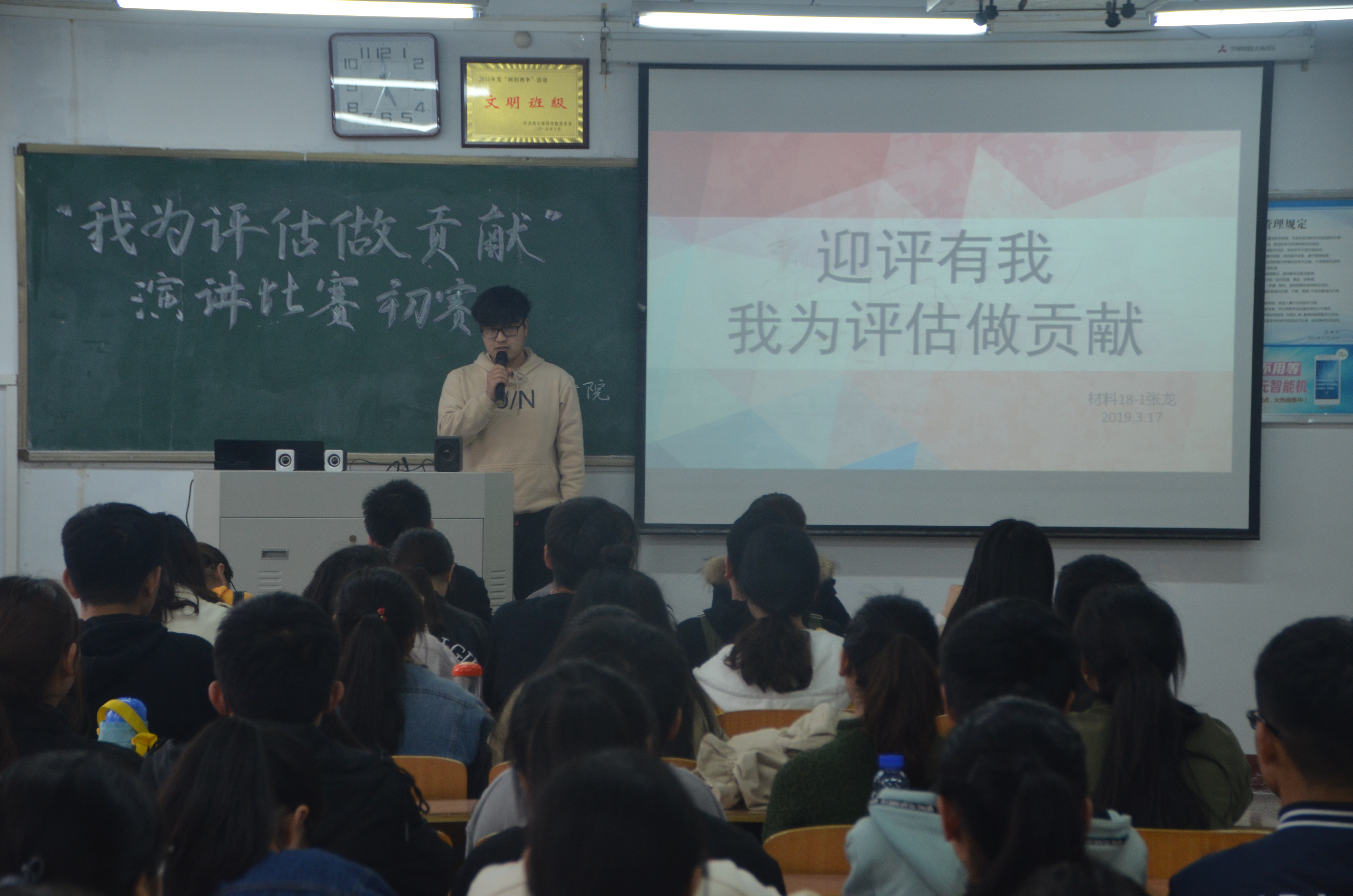 为了使全院同学全方位了解评估工作,形成人人“关注评估,参与评估,了解评估”的良好氛围,以主人翁的精神、饱满的热情和积极的态度投入到本科教学工作审核评估与建设中,金年会jinnianhuicom3月17日下午于睢阳校区1号楼408 教室举行了“我为评估做贡献”演讲比赛,金年会jinnianhuicom团总支副书记、学生会主席、副主席担任评委,院团学干部、各班学生代表观看了比赛。本次活动共有14名同学参赛,比赛在主持人激情洋溢的开场介绍中吹响了号角。