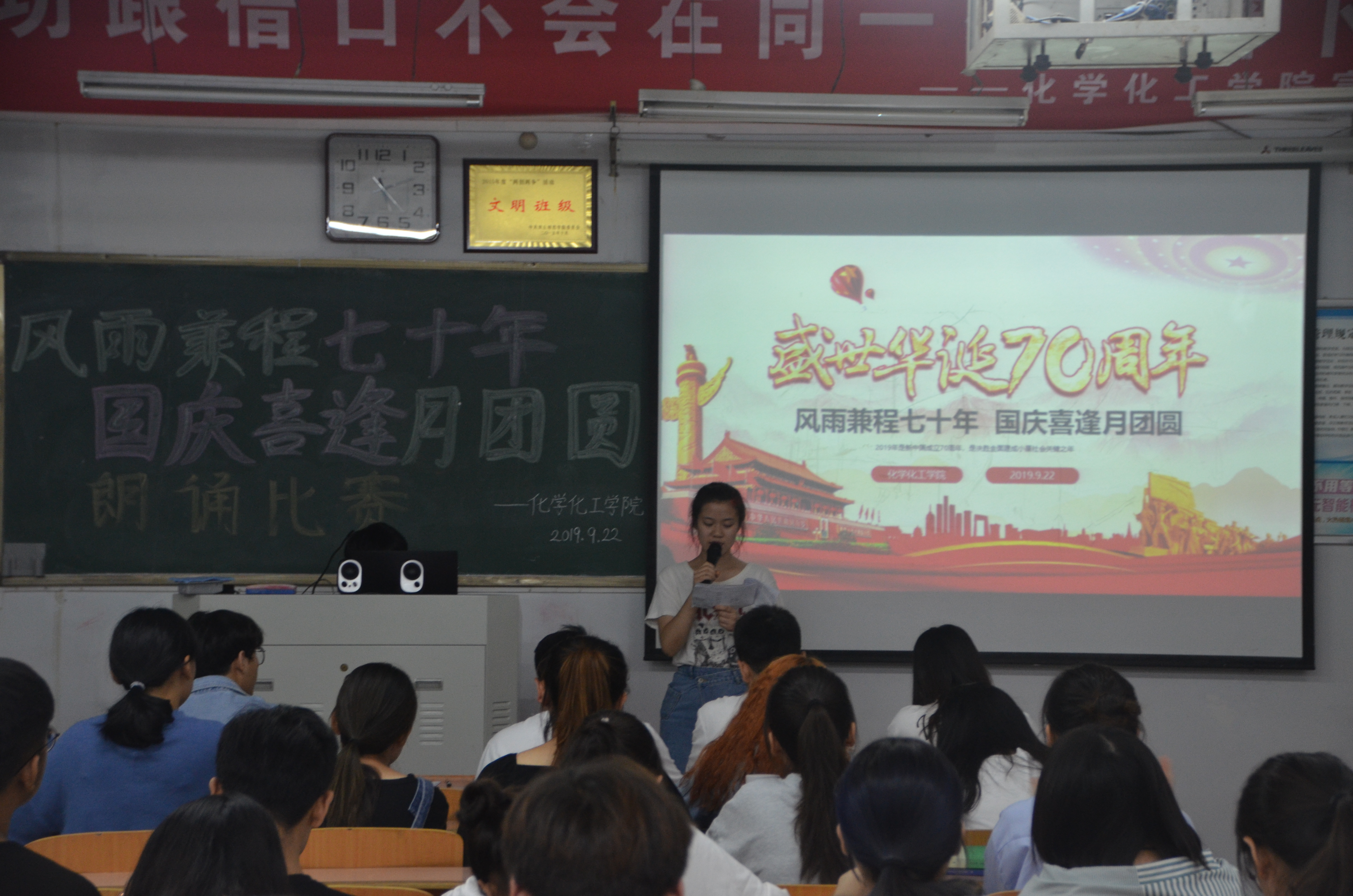 为大力弘扬爱国主义精神,讴歌中华民族实现伟大复兴中国梦的奋斗历程,追寻革命先辈的光辉足迹,2019年9月22日,金年会jinnianhuicom于睢阳校区1号楼408教室举办“风雨兼程七十年 国庆喜逢月团圆”朗诵比赛,18级各班部分学生参加活动。