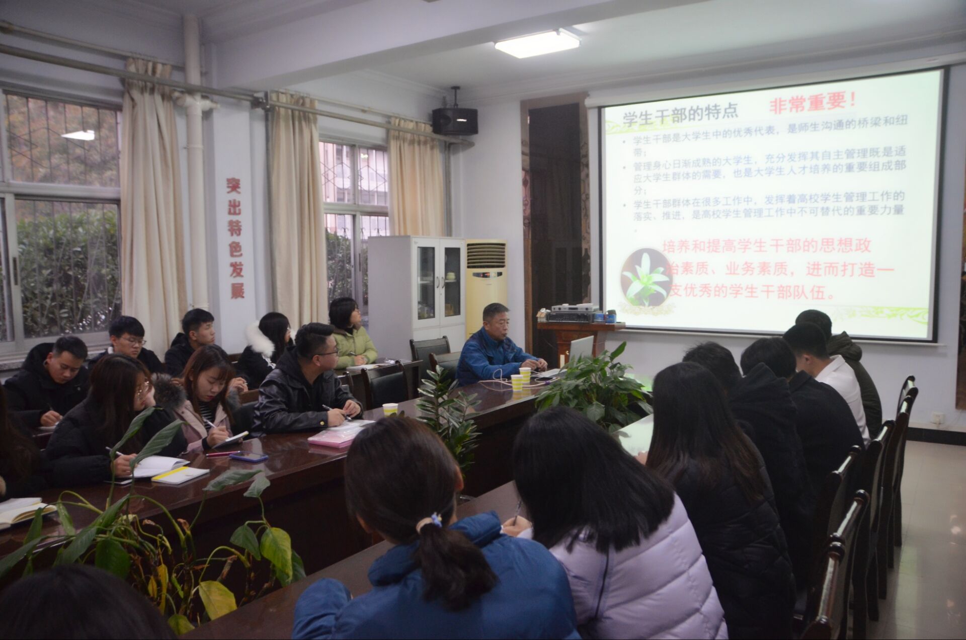 会议伊始,由刘瑛宣读团总支、学生会纳新名单,并向新生力量的加入表示祝贺。接着,韩忠民从五个方面对学生干部进行培训,一是学生干部应具备的基本礼仪,在仪表言谈举止方面注重的同时,要树立社会公德意识和服务意识;二是学生干部应具备的基本素质,要培养学生干部在思想政治道德和身心方面的基本素质;三是学生干部应具备的基本意识,安全、责任、团队、创新、服务和形象意识都是日常生活和工作中不可或缺的一部分;四是学生干部应具备的基本能力,要注重培养人际交往能力和随机应变能力以及在活动中的组织管理和创新决策能力;最后,韩忠民强调,学生干部要处理好与领导老师、同学以及其他学生干部之间的关系,尊重他人,上下一致,以德服人。