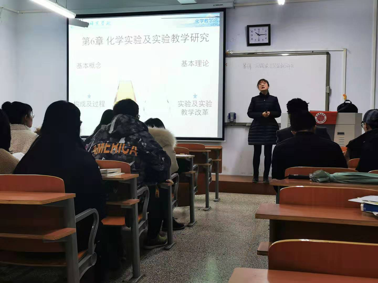 为了进一步加强金年会青年教师的培训与交流,促进金年会青年教师尽快适应学校转型发展和专业建设要求,提高教师的专业素质和教学能力,夯实教师驾驭课堂教学的基本功,本学期金年会开展了青年教师公开课活动。2019年12月16日上午,金年会青年教师张南在导师曹广秀教授指导下在睢阳校区1号教学楼407教室进行《化学教学论》公开课。化学系主任韦秀华副教授,青年教师导师曹广秀教授、刘新民老师、王晶晶老师等观摩了本次公开课。