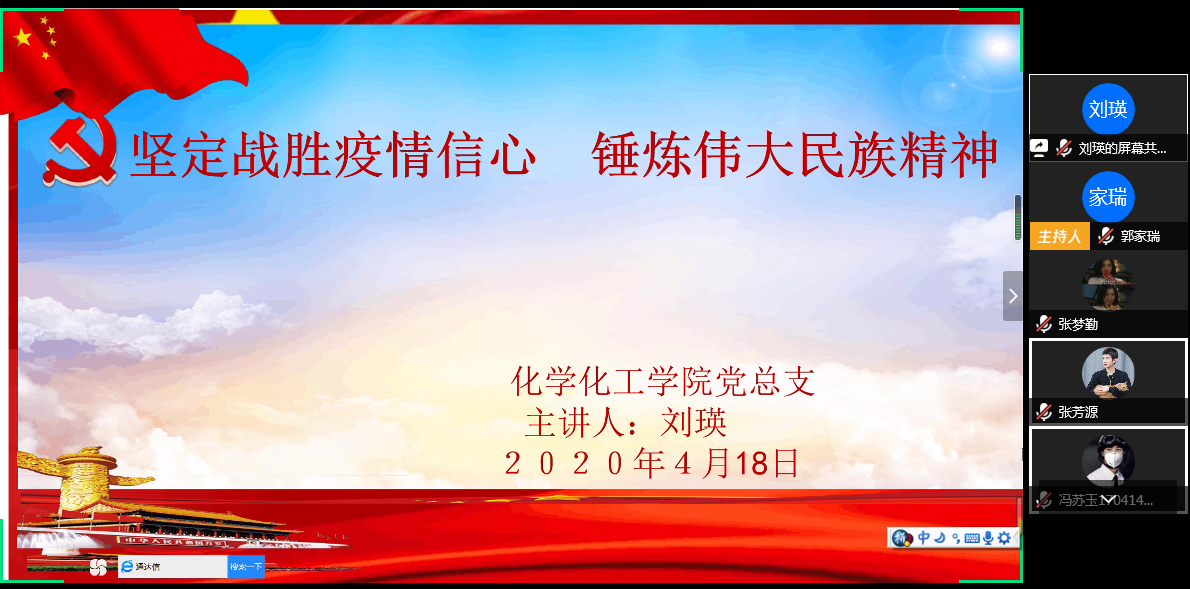 本次培训以线上集中培训为主,结合线下自学,通过线上专题党课培训、线上小组讨论、线下观红影、自学等方式进一步提高入党积极分子的政治理论素养,增强政治觉悟。在培训开班仪式上,党总支副书记刘瑛宣读了《金年会jinnianhuicom第46期入党积极分子培训计划》,强调培训内容以党的基本理论、路线、纲领等内容为重点,并紧密结合当前疫情防控形势进行。之后分别邀请学院党总支书记韩忠民、院长瞿鹏、党总支副书记刘瑛、学生第三党支部书记邵一方、学生第四党支部书记郭家瑞进入第46期党课“云课堂”为积极分子讲授专题党课,讲授内容既有对党章、对中国梦的解读,又有结合目前疫情防控形势对积极分子进行的爱国主义教育,既引导入党积极分子如何端正入党动机,又使积极分子清晰明确党员发展的方针和程序。线上专题党课讲授内容丰富,贴合培训实际,真正达到了培训的目的。