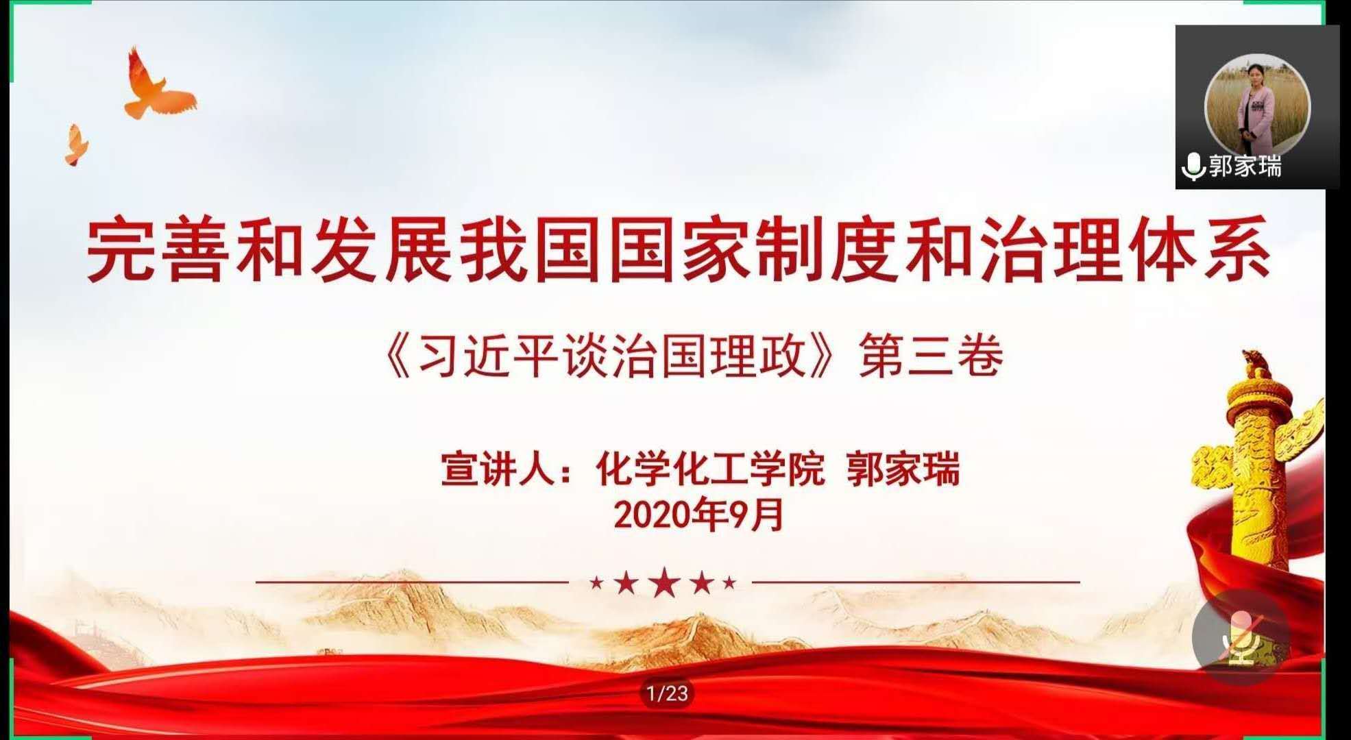 2020年9月19日,金年会jinnianhuicom在学院会议室举行《习近平谈治国理政》第三卷理论宣讲进支部活动,本次宣讲活动通过线下、线上的方式开展,校团委副书记时光在线参加,宣讲人为金年会jinnianhuicom辅导员郭家瑞。