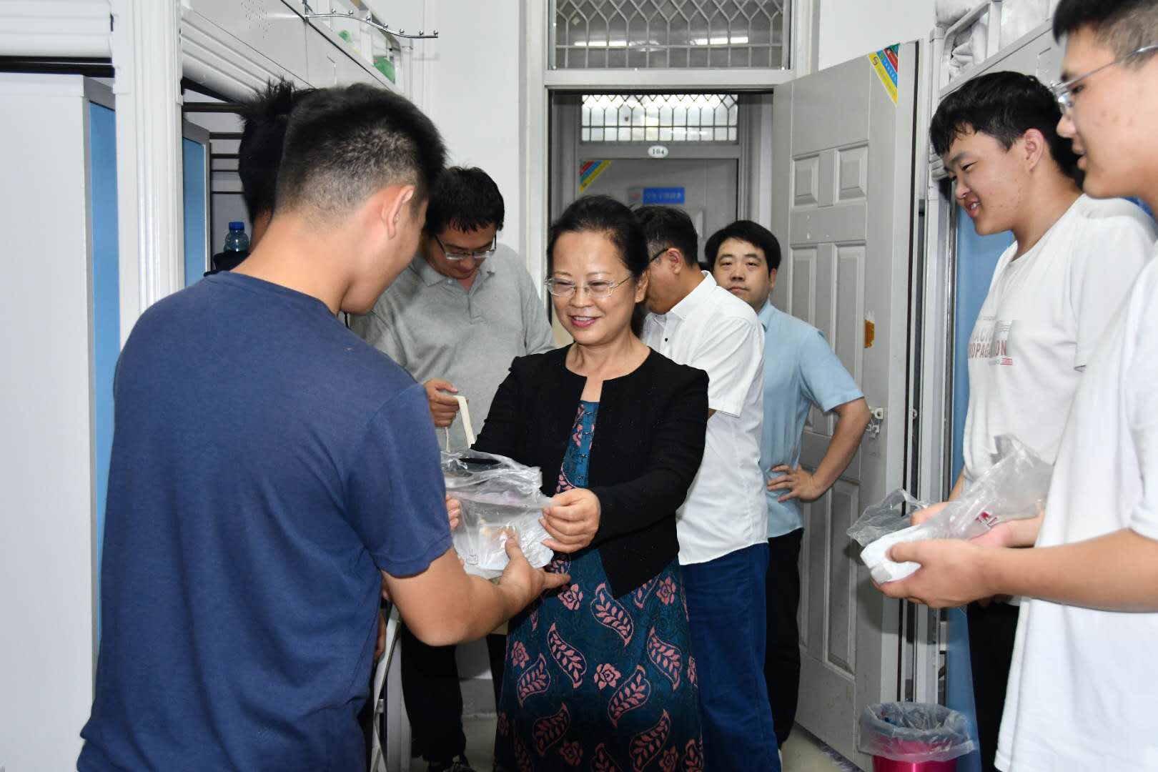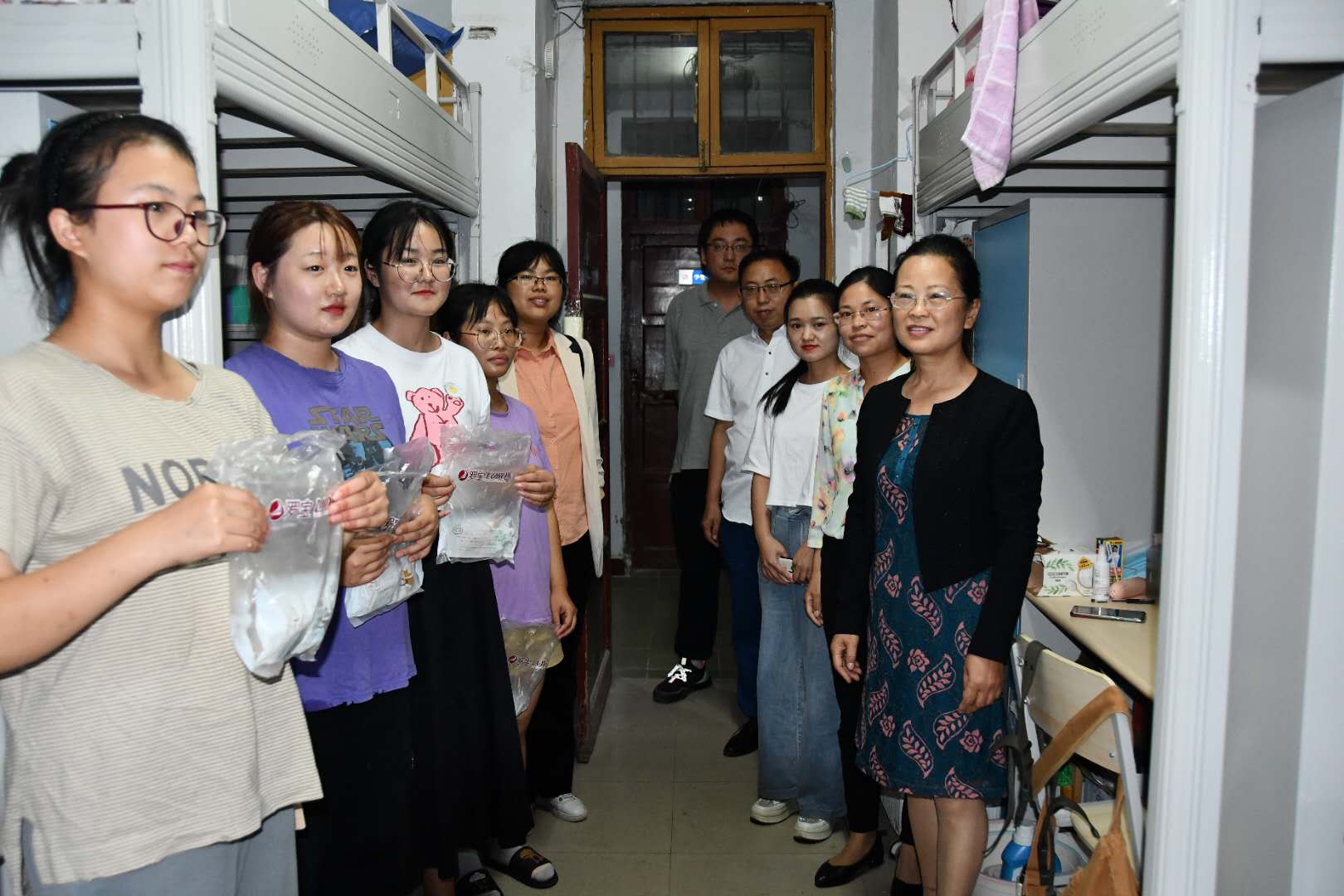 当中秋邂逅国庆,名为家国同庆,欢聚的门化成皎洁的明月带远方的人回家,让长挂星空的思念落地,点亮万家灯火,温暖中华大地。为了让新生感受到家一般的温暖,2020年9月30日下午,金年会jinnianhuicom党总支副书记刘瑛带领辅导员、2020级新生班主任到宿舍看望慰问新生,并为新生发放月饼,送上国庆、中秋双节祝福。
