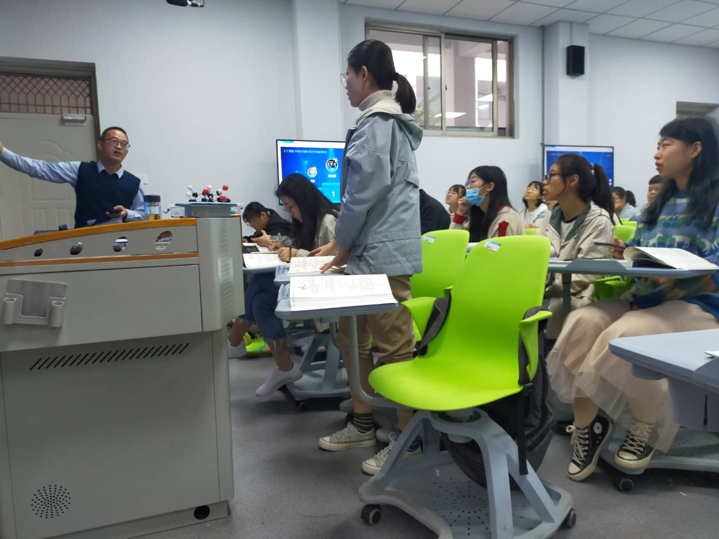 刘新明老师首先向各位观摩教师介绍了《有机化学》课程线上线下混合式教学范式改革的目标、改革的举措以及具体的实施情况。充分体现有机化学课程“高阶性、创新性、挑战度”的建设目标,践行“以学生为主体,以教师为主导”的教学理念。此次公开课的内容是第五章,对映异构的串讲,刘老师通过学生汇报、教师总结、提问、抢答等形式开展了教学,充分调动了学生的主观能动性,课堂气氛十分活跃,学生对对映异构特别是手性标记也有了更好的理解。