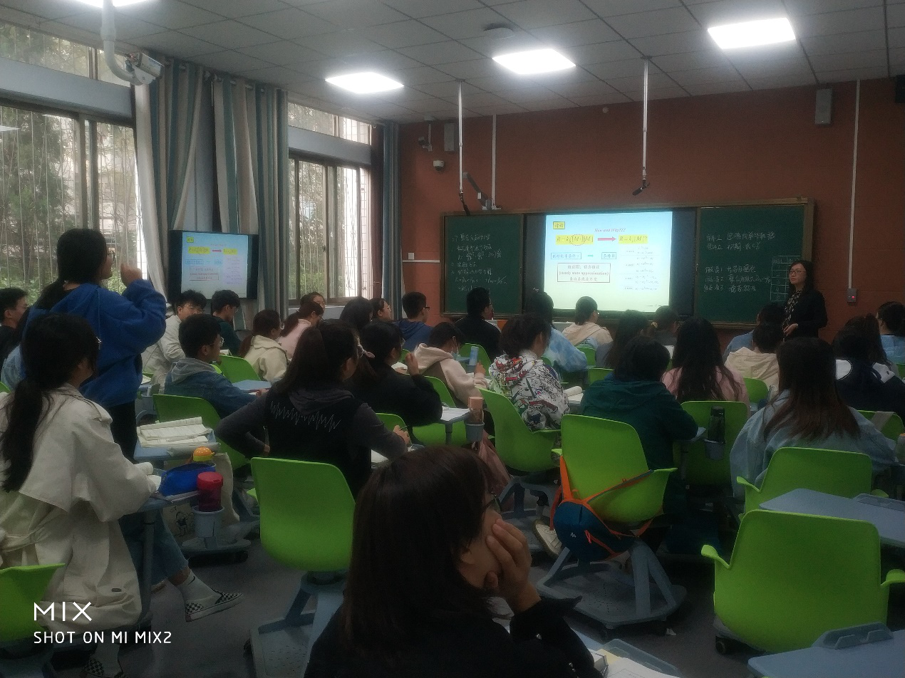 公开课前,邵梅玲老师首先向各位观摩教师介绍了《高分子化学》课程范式改革的目标、改革的举措以及具体的实施情况。此次公开课的内容是“自由基聚合动力学研究”,采用采用随机选人、抢答和主题讨论的教学模式,课程开始前首先对上节课内容进行了简单回顾,由各小组成员对每个知识点先进行梳理并讲解。然后在动力学方程推导过程涉及的条件及假设由分组讨论并抢答的形式让学生自己提出要点,老师进行理论提升和总结。整个课程内容充实设计巧妙,学生参与度高,积极性强,充分彰显了“以学习者为中心”的教学理念,学生自主学习的能力、实践能力、沟通合作的能力得到了极大的提升。