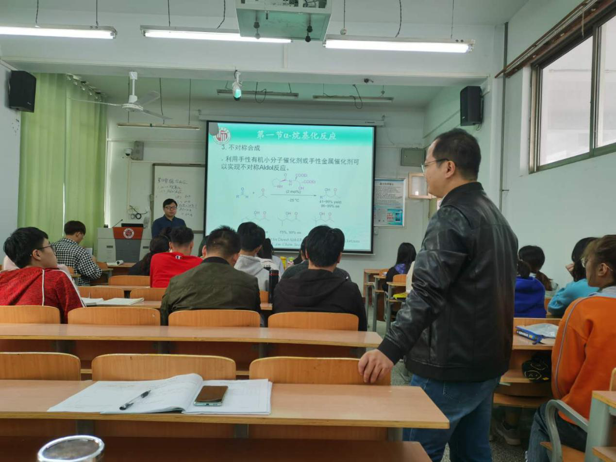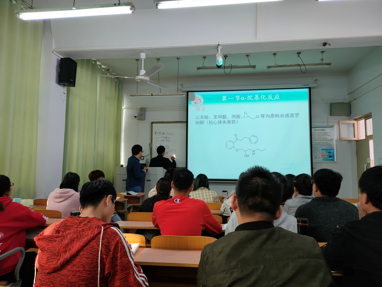 本次公开课主要讲解了第四章缩合反应中Aldol反应的定向缩合方法以及Aldol反应在药物合成中的应用。教学过程中设计知识点回顾、重难点分析及重难点讲解环节,采取板书和多媒体辅助等教学手段,以问题为导向,采用讲解、提问等教学方法,形成有效师生互动。本次公开课进展顺利,高效地实现了课堂教学目标,充分体现“以学生为主体,以教师为主导”的课堂教学理念,课堂上同学们参与度高,学生学习氛围和学习效果较好。