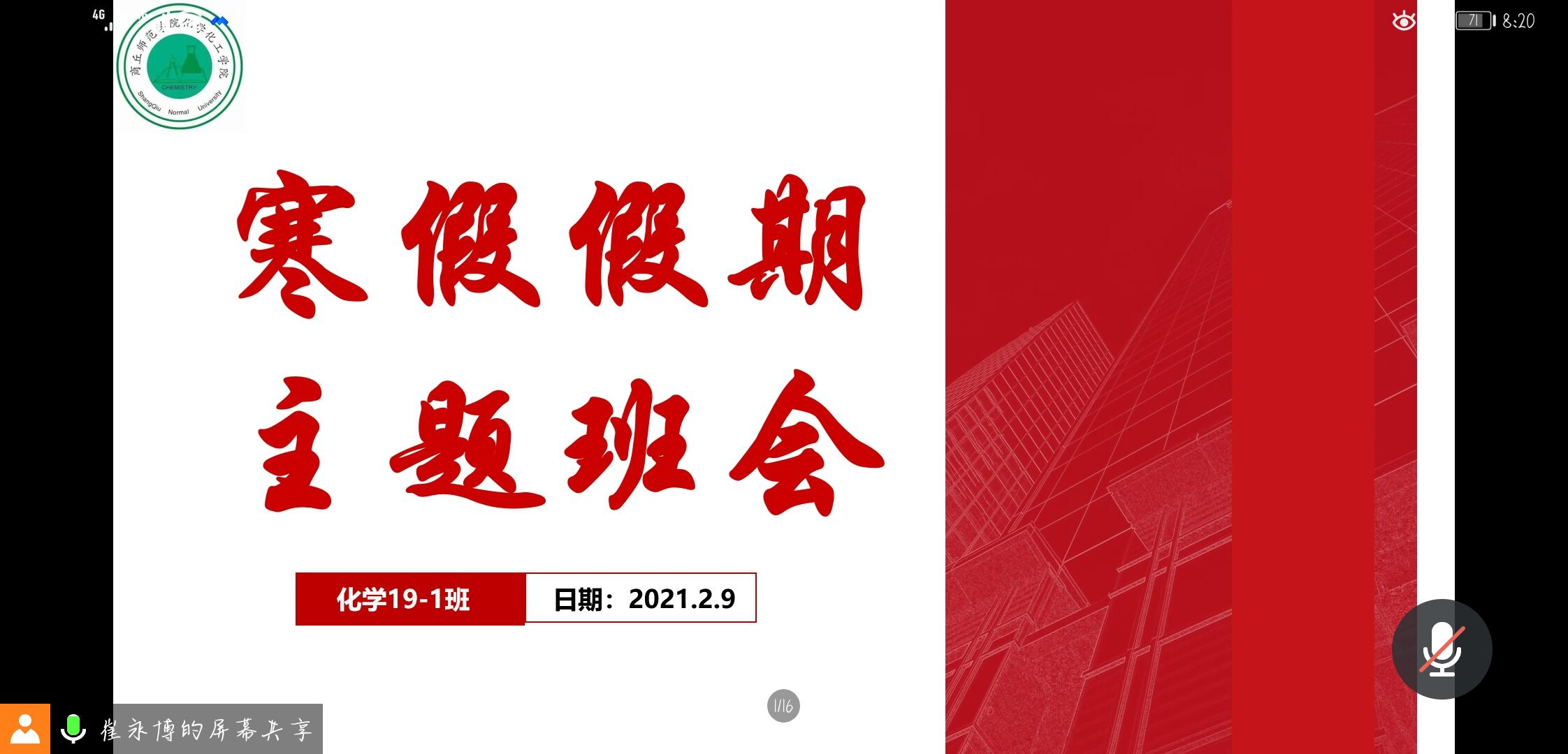 为使同学们更加深入学习习近平总书记近期重要讲话精神、积极制定并完成寒假学习生活目标、增强安全意识,2月9日晚上20:30,金年会jinnianhuicom化学19-1班于腾讯会议举行了寒假假期主题教育班会。化学19-1班班主任张银堂以及全班同学参加。