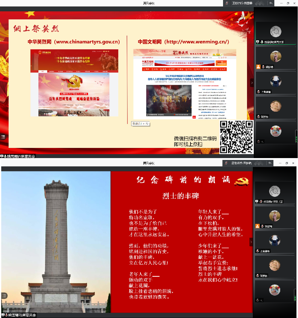 活动开始,在魏世民同志领誓下,重温入党誓词。张芳源、蔡莹两位同志分享了李大钊、陈祥榕等多位革命先烈和人民英雄的故事,支部成员们一起学习英烈事迹。之后,进行网上祭英烈,通过登录中国文明网或中华英烈网,进行网上哀悼、鞠躬、献花、寄语留言等祭扫仪式,向革命先烈、人民英雄致敬,云端寄哀思。此外,为缅怀人民英雄,致敬他们的牺牲与奉献,田梦格同志深情朗诵了《烈士的丰碑》。