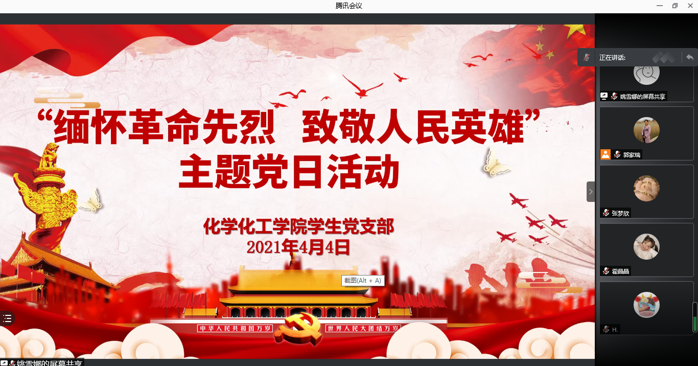 为缅怀英烈、铭记历史,牢记初心,勇担使命,4月4日清明节,金年会jinnianhuicom学生党支部在线开展了“缅怀革命先烈,致敬人民英雄”主题党日活动,向所有为民族独立、人民幸福而牺牲的先烈英雄致敬。全体学生党员和党支部书记参加活动。