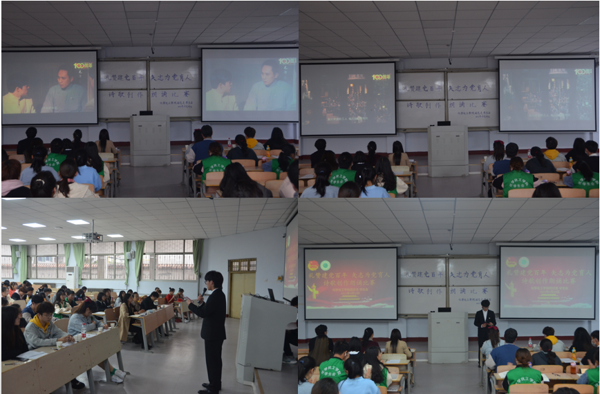为隆重庆祝中国共产党成立100周年,引导学生弘扬革命传统、传承红色精神,鼓起迈进新征程、奋进新时代的精气神,2021年4月24日,金年会jinnianhuicom于睢阳校区1教学号楼107教室举行 “礼赞建党百年,矢志为党育人”诗歌创作朗诵比赛。党总支副书记刘瑛、团总支副书记郭家瑞、学工办副主任史展出席,各年级学生代表参加。