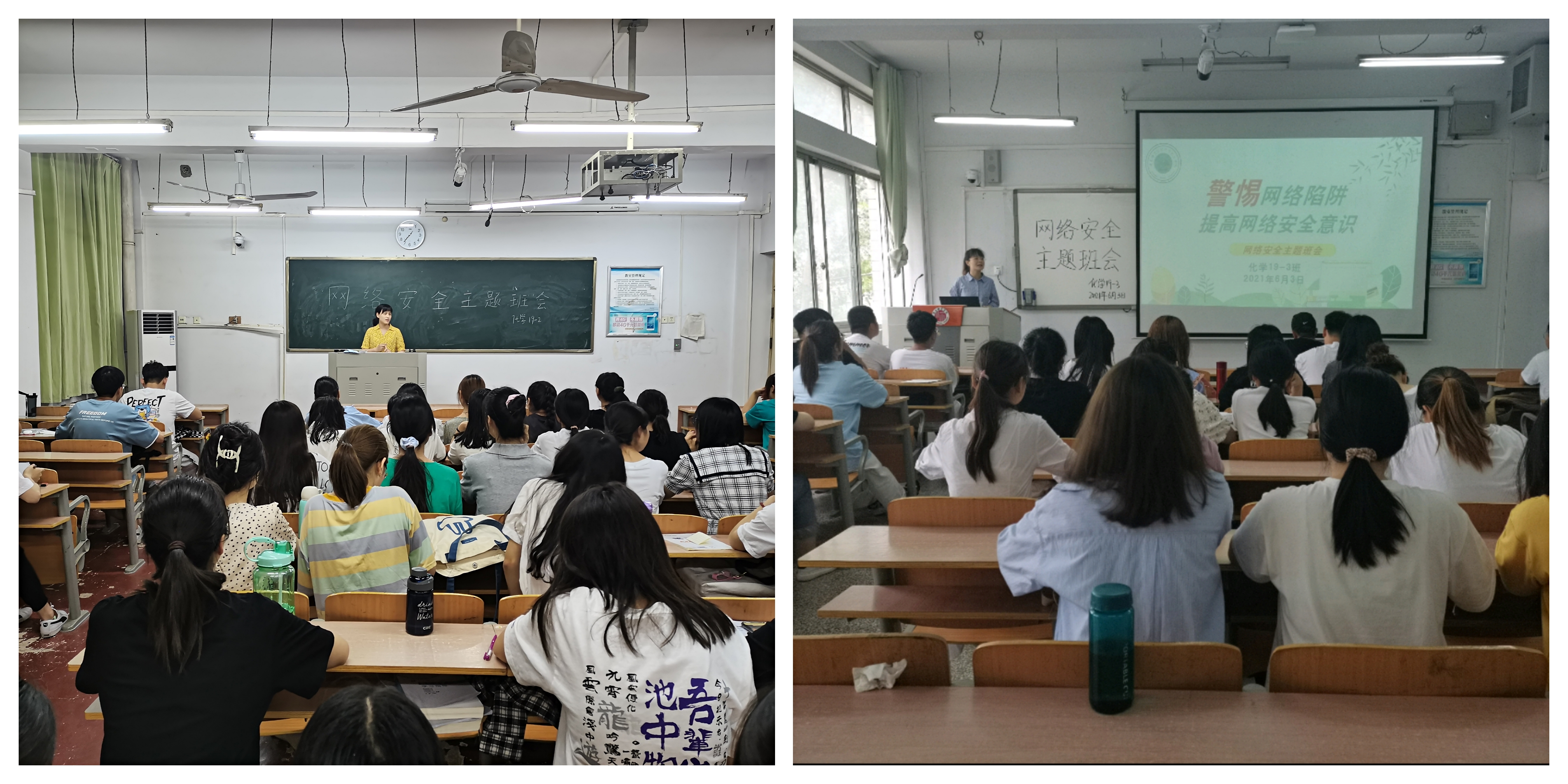 19级辅导员李政道和李宁娅列举当下热门网络事件和网民评论,用真实事例展开分析,提示同学们不仅要培育积极向上的网络心态以及提升网络媒介素养,更要自觉遵守网络秩序。化学19-3班主任张南从“什么是网络安全”、“网络的正面负面影响”、“如何健康文明上网”等几个方面展开讲述,提醒学生提高安全意识,垃圾信息不要轻信、陌生链接不要乱点、不健康网页不要浏览,不当言论不要转发,让学生明白网络安全的重要性,倡导学生健康文明绿色上网,合理使用网络资源。化学19-2班班主任吴冬青围绕“防范网络诈骗,正确看待网络热点”等问题,向同学们介绍了常见的诈骗手段以及我国网络安全法律法规,引导同学们文明绿色上网,规范发表网络言论,时刻保持清醒,不被网络诈骗利用,不信谣不传谣,做新时代的阳光健康好青年。材料19-1班主任张永亚和新能源19-1班主任张安安结合具体案例对网络安全隐患和网络安全常识进行了讲解,引导学生增强网络安全意识。
