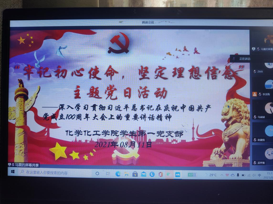 8月11日,学生第一党支部以“牢记初心使命,坚定理想信念”为主题在线召开了主题党日活动。会上,党支部书记李龙梅首先带领党支部成员学习习近平总书记在庆祝中国共产党成立100周年大会上的重要讲话精神,并强调作为党员要深刻领会伟大建党精神的重大意义、丰富内涵,深刻领会伟大建党精神是中国共产党的精神之源,深刻领会中国共产党弘扬伟大建党精神,在长期奋斗中构建起的中国共产党人的精神谱系,锤炼出的鲜明政治品格,更好地弘扬光荣传统、赓续红色血脉,永远把伟大建党精神继承下去、发扬光大。党员同志们在会上积极分享了自己在学习习近平总书记重要讲话精神的体会和感悟,纷纷表示会深刻领会讲话的重大意义、丰富内涵、核心要义、实践要求,切实把思想和行动统一到讲话精神上来,努力学习科学文化知识,提高自己的专业技能,以青春之我、奋斗之我,为民族复兴铺路架桥,为祖国建设添砖加瓦。