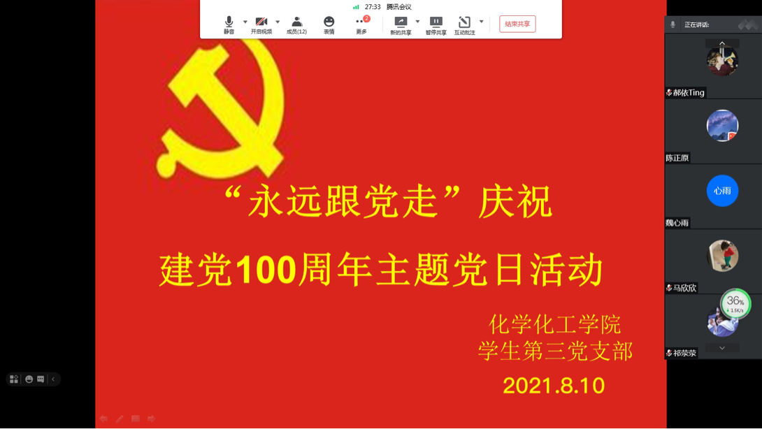 8月10日,金年会jinnianhuicom学生第三党支部通过腾讯会议组织开展“永远跟党走”庆祝建党100周年主题党日活动,党支部书记史展首先带领全体党员深入学习了习近平总书记的重要讲话精神,引领广大同志听党话跟党走,做伟大事业的建设者、文明风尚的倡导者、敢于追梦的奋斗者,以实际行动向党的百年华诞献礼,为全面建设社会主义现代化国家贡献青春力量。其次,史展强调要在疫情仍在全球蔓延时期认真做好疫情排查工作,做到数据准确,及时做好防疫工作,做好自我保护。最后,支部全体党员表示,要始终坚持人民至上,立志为党分忧、为国尽责、为民造福,以实际行动诠释对党的忠诚之心、对人民的赤子之心。尤其是在这个疫情险峻的时刻,要全力以赴做好防控工作,树立高度的责任意识,打赢疫情防控狙击战。