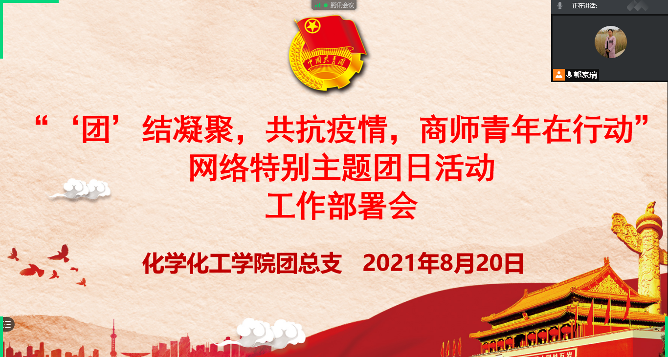 8月20日,金年会jinnianhuicom团总支在线召开专题会议,安排布置开展“‘团’结凝聚,共抗疫情,商师青年 在行动”网络特别主题团日活动,团总支学生兼职副书记、组织部工作人员、各团支部书记参会,会议由院团总支副书记郭家瑞主持。