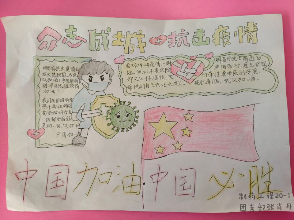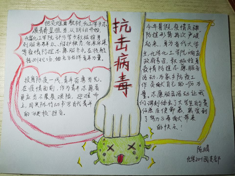 在抗击疫情的过程中,我们身边不乏感人的抗“疫”小故事,为了宣传学习他们的感人事迹,8月21日至29日,金年会jinnianhuicom团总支于开展了“勇克时艰,为你点赞”抗“疫”志愿行手抄报、绘画、海报征集的线上主题活动。同学们纷纷以手抄报、绘画、海报的形式,积极展现身边的抗“疫”事迹,为身边的抗“疫”青年宣传打call。下面一起来看看优秀作品吧。