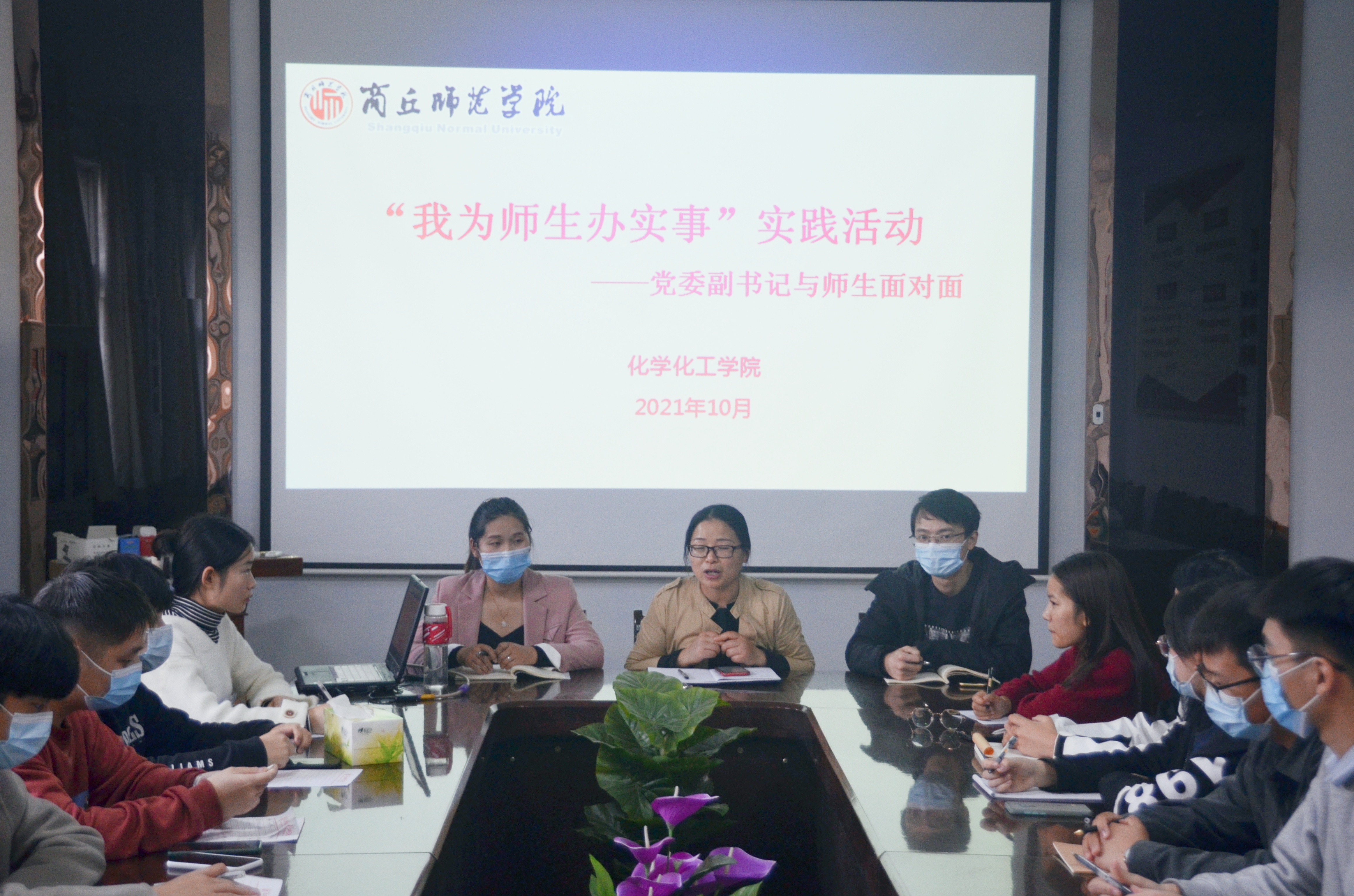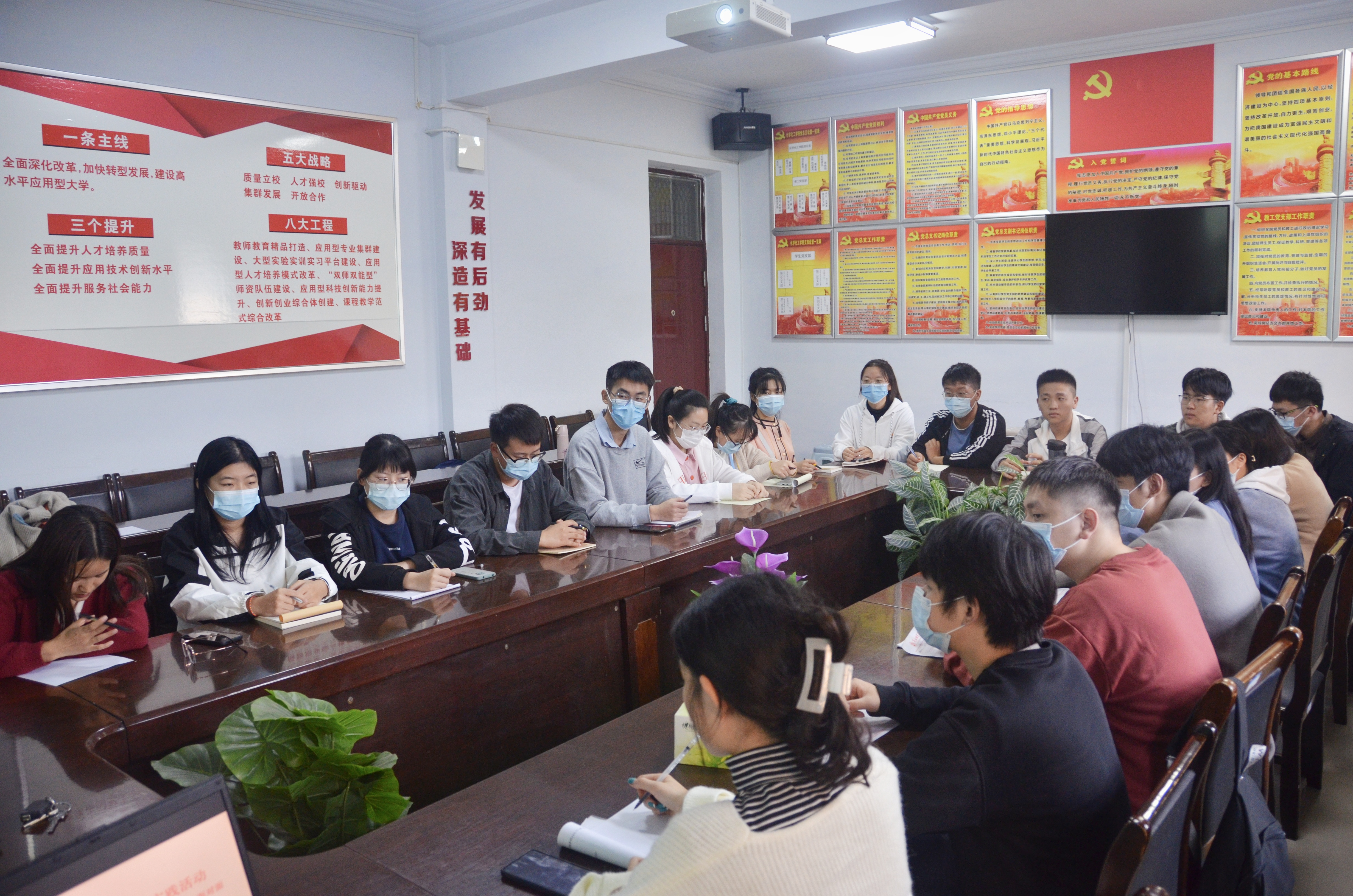 为号召广大师生学党史、悟思想、办实事、开新局,将党史学习教育与服务师生相结合,10月13日下午5点,金年会jinnianhuicom于睢阳校区七号楼会议室召开“我为师生办实事”实践活动。党委副书记张颜梅主持,学工办副主任史展、辅导员李宁娅以及19级、20级班委参加。