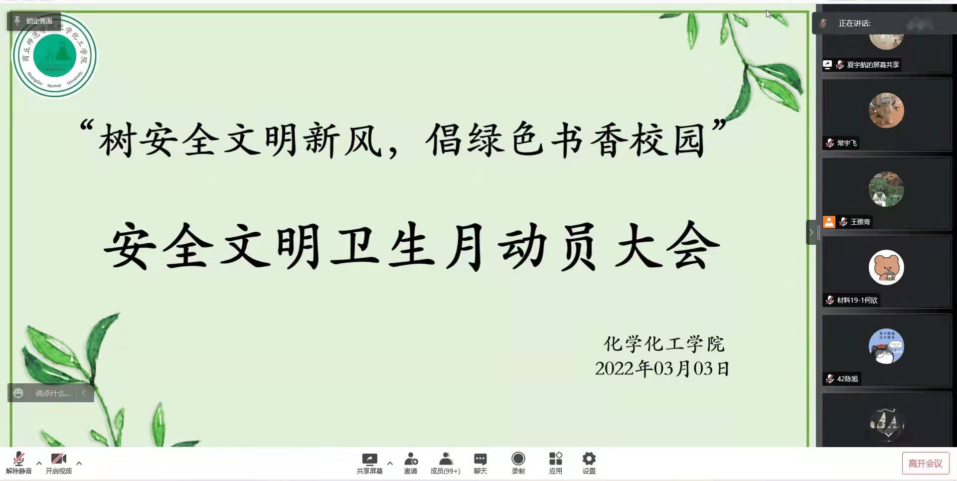 为推进校园精神文明建设,建设绿色书香校园,3月3日,金年会通过腾讯会议举办了“安全文明卫生月”活动动员大会。党委副书记张颜梅、全体辅导员、寝室长和学生会成员参加。