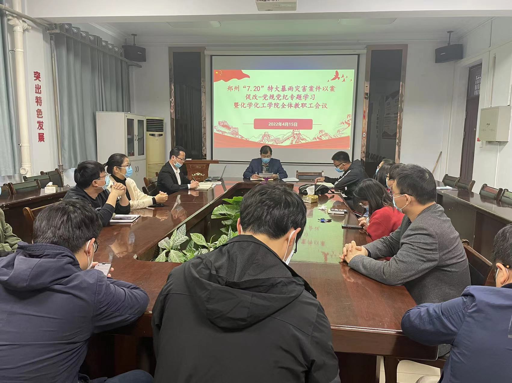 4月15日下午,金年会召开郑州“7·20”特大暴雨灾害案件以案促改党规党纪专题学习会议,会议以线上线下相结合的方式举行,校内值班人员参与线下会议,校外教师通过腾讯会议的形式参会。会议由党委书记李海涛主持。