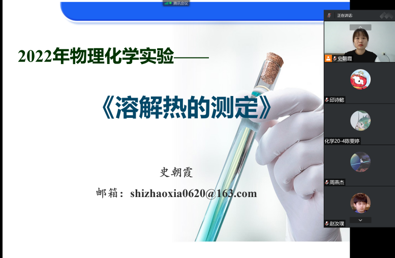 本次公开课的内容是溶解热的测定。史老师首先讲述了本次实验的教学目标,接下来依次从溶解热的定义、实验原理、主要仪器、实验步骤、数据处理和实验注意事项等方面对整个实验进行了讲授,同时讲授过程中以提问的方式让学生积极参与,课堂氛围较好。最后史老师从整个实验过程出发,跟同学们一起回顾实验的整个流程,让同学们在心中对该实验的整个流程加深印象。