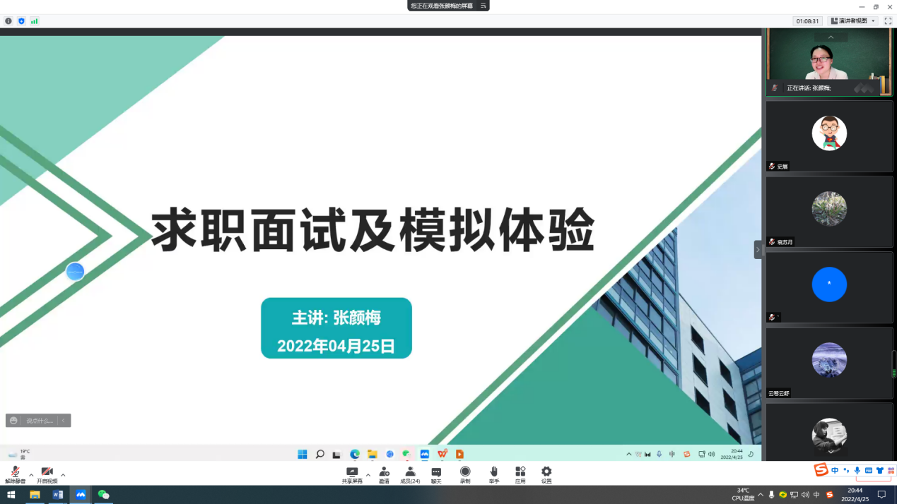 为增强2022届预毕业生求职面试应对能力,4月25日,金年会jinnianhuicom利用腾讯会议开展了《求职面试及模拟体验》讲座,院党委副书记张颜梅主讲,2022届预毕业生参加。