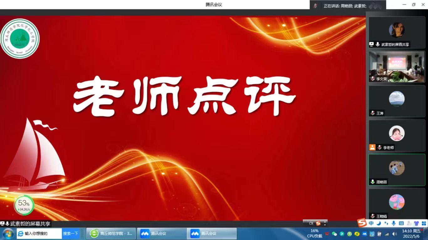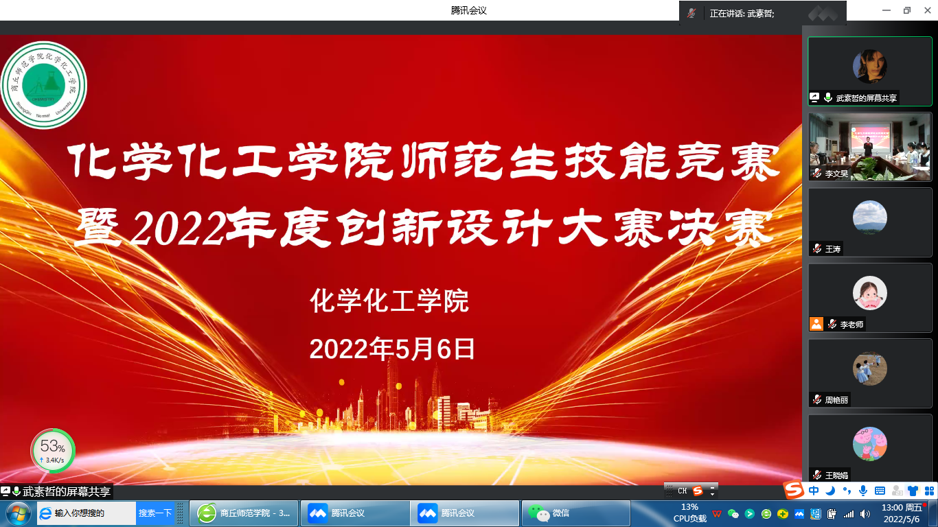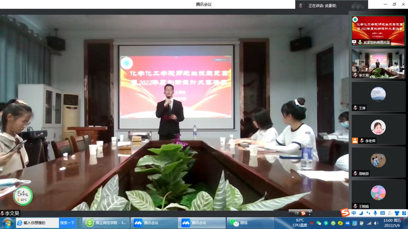 为提升化学师范生教育教学能力,提高PPT创新设计能力,5月6日,金年会jinnianhuicom于睢阳校区7#104会议室举行了化学专业师范生技能竞赛暨2022年度PPT创新设计大赛决赛。院党委副书记张颜梅、副院长周艳丽、副院长王涛及专业评委老师出席本次活动。