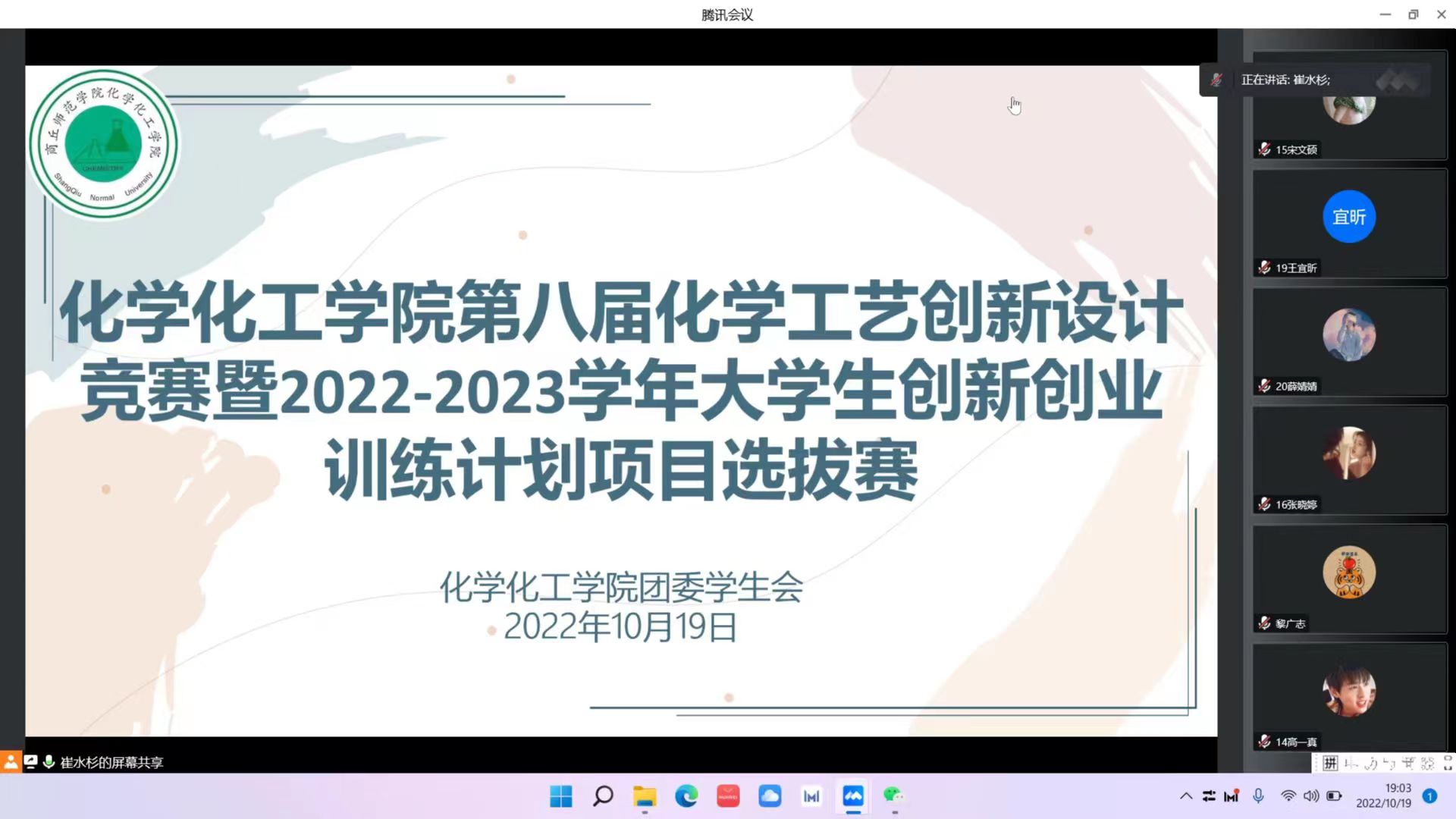 为增强大学生发现问题、分析问题和解决问题的能力,培养大学生的创新意识、创新能力和创新精神,对专业知识进行系统提升,培养工艺设计理念,培养团队协作精神。10月19日,金年会jinnianhuicom通过线上线下结合的方式举行了第八届化学工艺创新设计竞赛暨2022-2023学年大学生创新创新训练计划项目选拔赛。
