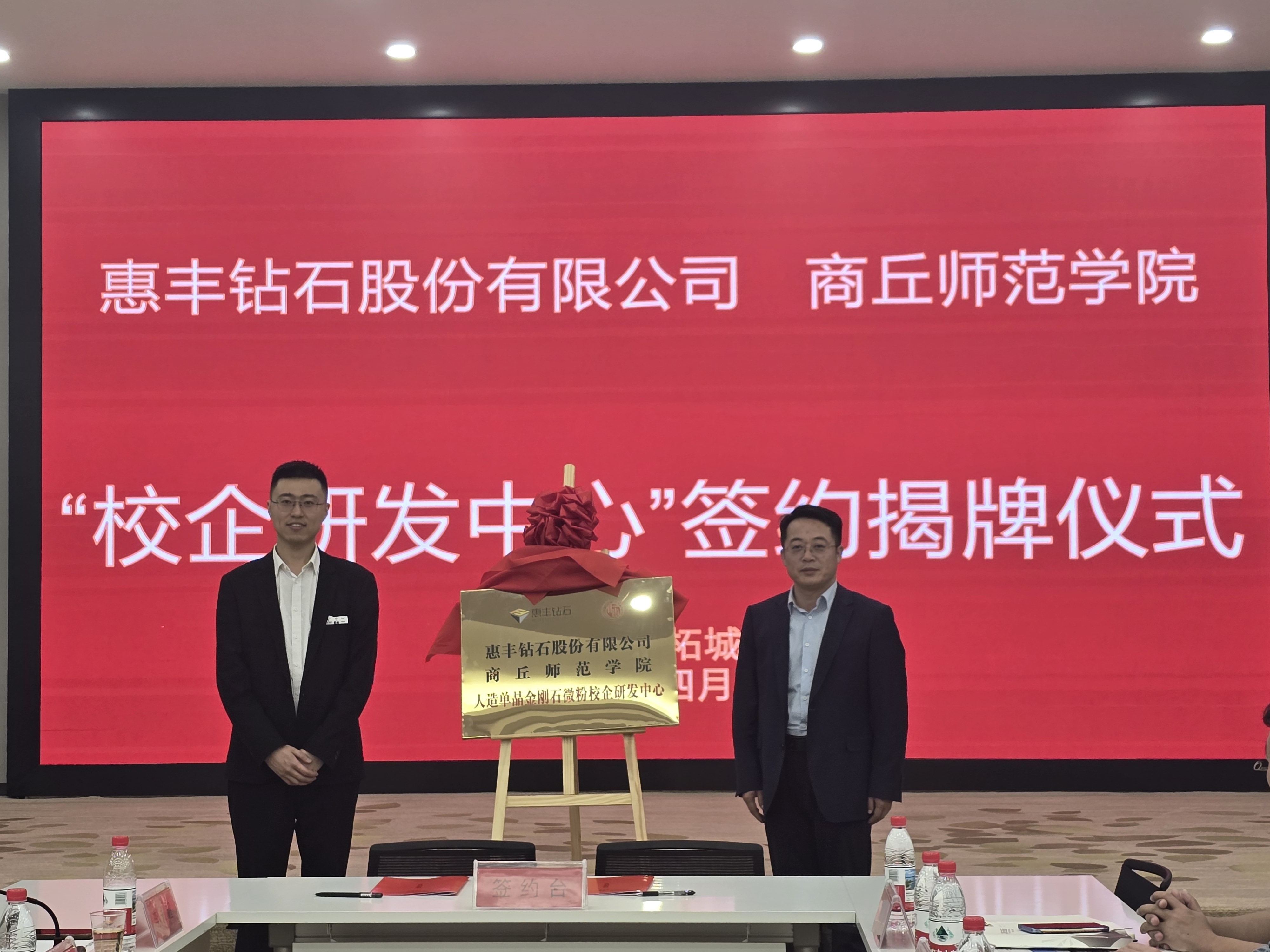 4月16日,副校长翟滨带领校地合作与服务中心、金年会jinnianhuicom一行7人到惠丰钻石股份有限公司举行“校企研发中心”签约揭牌仪式并进行访企拓岗活动。柘城县科技局局长田波波、副局长张涛、惠丰钻石股份有限公司总裁韩敬贺,副总经理鲍思玮、生产总部总监李永超等出席活动。