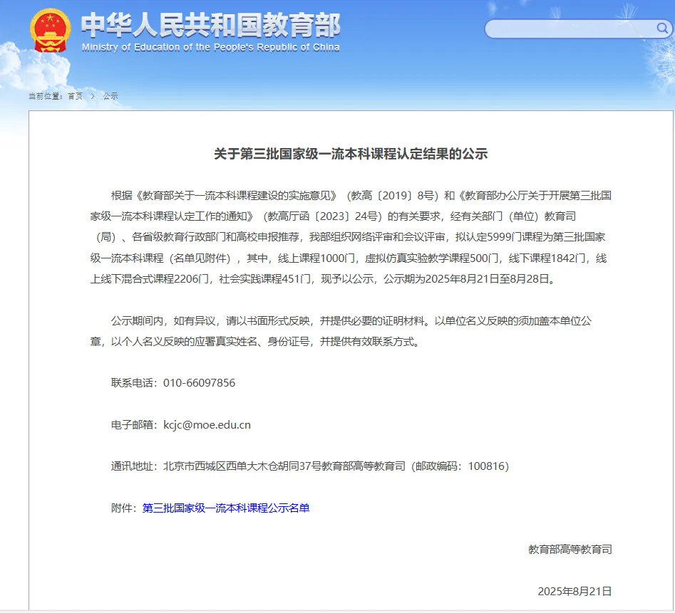 2025年8月21日,教育部官方网站对第三批国家级一流本科课程认定结果进行公示,此次全国共有5999门课程入选。金年会jinnianhuicom《物理化学》课程成功获批为国家级线上线下混合式一流课程。