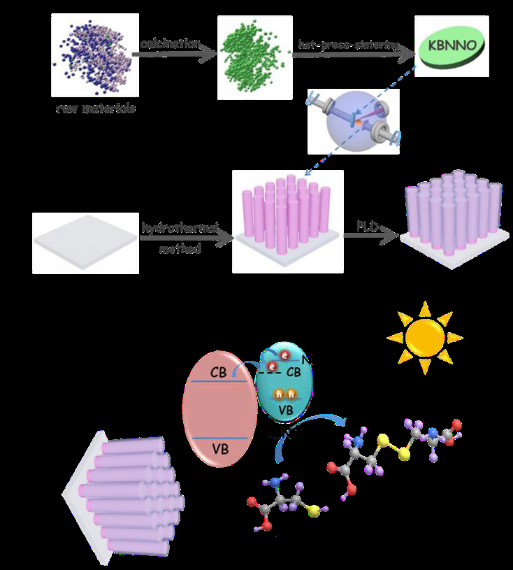该项工作采用传统高温固相合成方法制备了Ba/Ni掺杂的KNbO3基铁电钙钛矿氧化物([KNbO3]1-x[BaNi1/2Nb1/2O3-δ]x,KBNNO),利用脉冲激光沉积技术将其溅射沉积到水热法合成的TiO2纳米棒阵列上,形成KBNNO@TiO2NRs异质结构。在光照条件下,与TiO2NRs电极相比,KBNNO@TiO2NRs(x = 0.3)光阳极的光电流密度提高了5.1倍,并在PEC检测L-半胱氨酸分子时,展现出优异的选择性和较高的灵敏度。该工作揭示并验证了铁电钙钛矿氧化物基异质结构在光电生物分析中应用的可能性,希望为未来开发更加先进的、选择性更好、分析速度更快、灵敏度更高的其他类别铁电体基异质结构提供一定的借鉴。其成果“Ferroelectric Perovskite Oxide@TiO2Nanorods Heterostructures: Preparation, Characterization and Application as Platform for Photoelectrochemical Bioanalysis”于近期以第一作者、第一单位在Analytical Chemistry上发表。