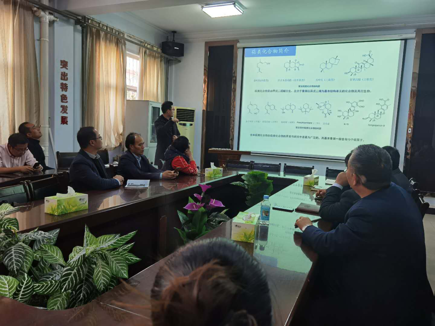 户博士向大家介绍了自己攻读博士学位期间关于天然产物Hongoquercins 类和Phenylspirodrimanes 类混源萜的合成研究工作以及将来的工作计划。户博士首先介绍了两种混源萜类化合物研究背景、研究进展以及亟待解决的关键科学问题等,然后具体讲解了两种混源萜类骨架化合物的合成路线。合成过程中主要经历了区域选择性的环氧化反应、Cp2TiCl催化自由基串联环合反应、路易斯酸BF3·Et2O介导下发生Friedel–Crafts烷基化反应、单质碘和NIS引发的环合反应等,最终得到了预期产物Hongoquercin B以及类似物。