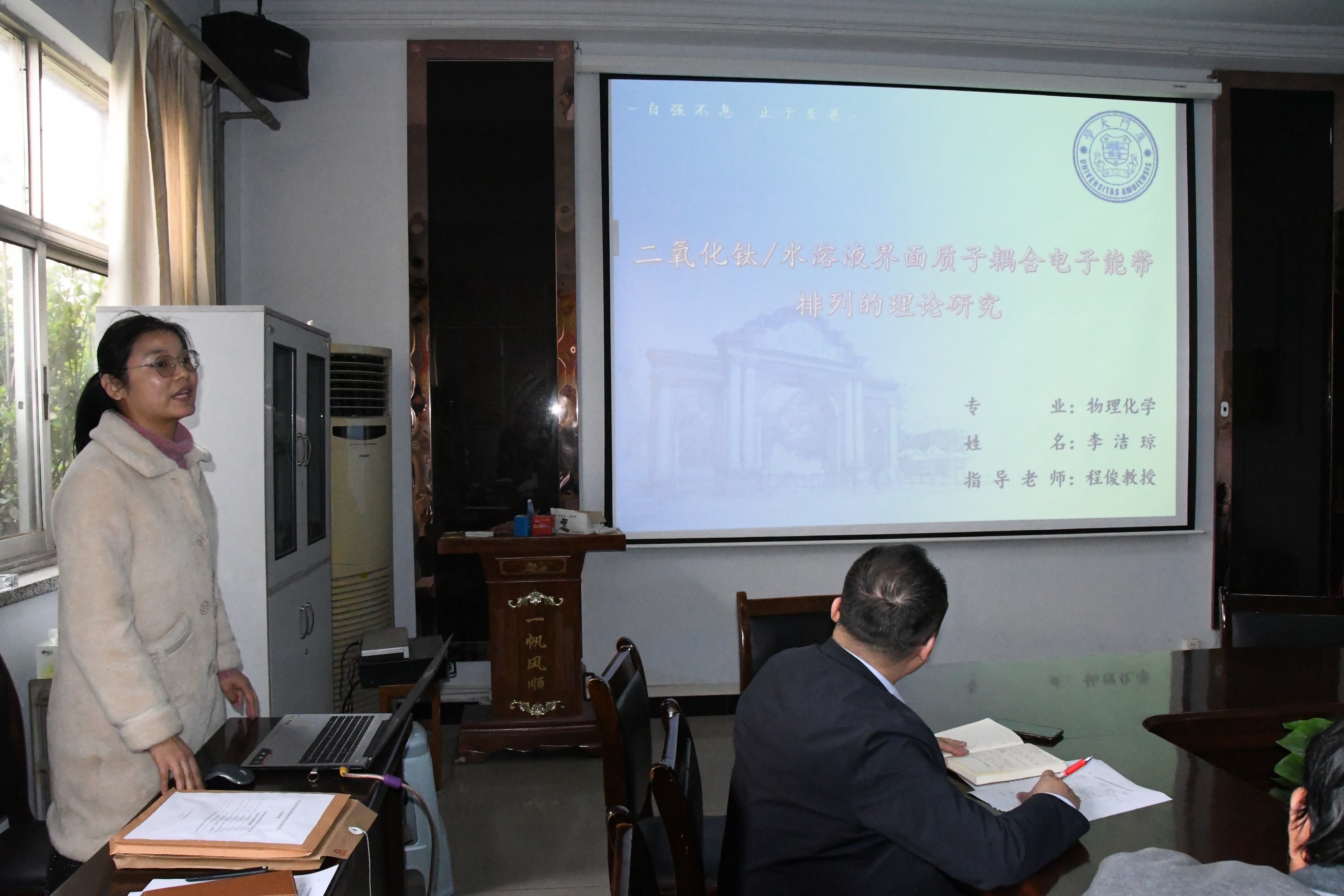 2021年03月05日下午,金年会jinnianhuicom金年会jinnianhuicom进行了本学期第一期博士论坛。青年教师李洁琼博士在睢阳校区7号楼金年会jinnianhuicom一楼会议室做了题为《二氧化钛/水溶液界面质子耦合电子能带排列的理论研究》的学术报告。本次博士论坛由副院长周艳丽主持,金年会jinnianhuicom全体教师参加了论坛。