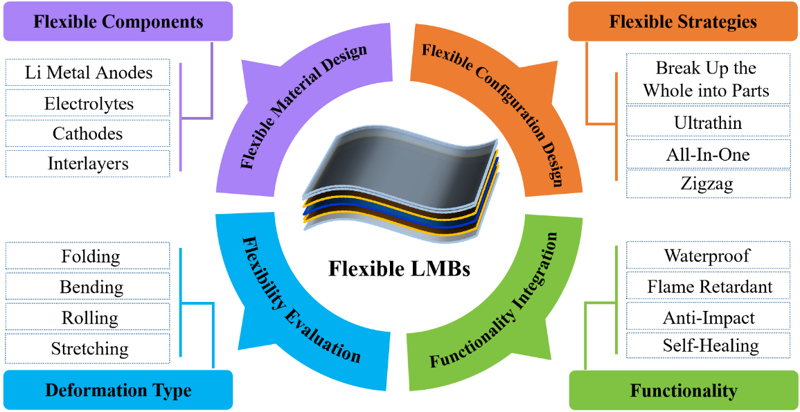 随着现代科技水平的高速发展,轻小化、高能量密度的柔性可穿戴储能设备正成为改善人们生活需求必不可少的电子元件。然而,锂离子电池作为主要的储能电源,其能量密度正逐渐接近其理论极限。因此,近年来以金属锂为负极的锂金属电池(LMBs)因具有极高的能量密度而得到复兴,有望成为新一代柔性电源的理想替代品之一。柔性锂金属电池的开发仍处于起步阶段,在柔性材料设计、柔性结构设计以及电池性能和安全性上仍有诸多问题亟待解决。